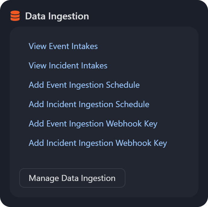 Data Ingestion: The View Event Intakes, Add Event Ingestion Schedule and Add Event Ingestion Webhook Key links redirects users to the Event Intake tab in the Data Ingestion module. The View Incident Intakes, Add Incident Ingestion Schedule and Add Incident Ingestion Webhook Key links take users to the Incident Intake tab within the same module.