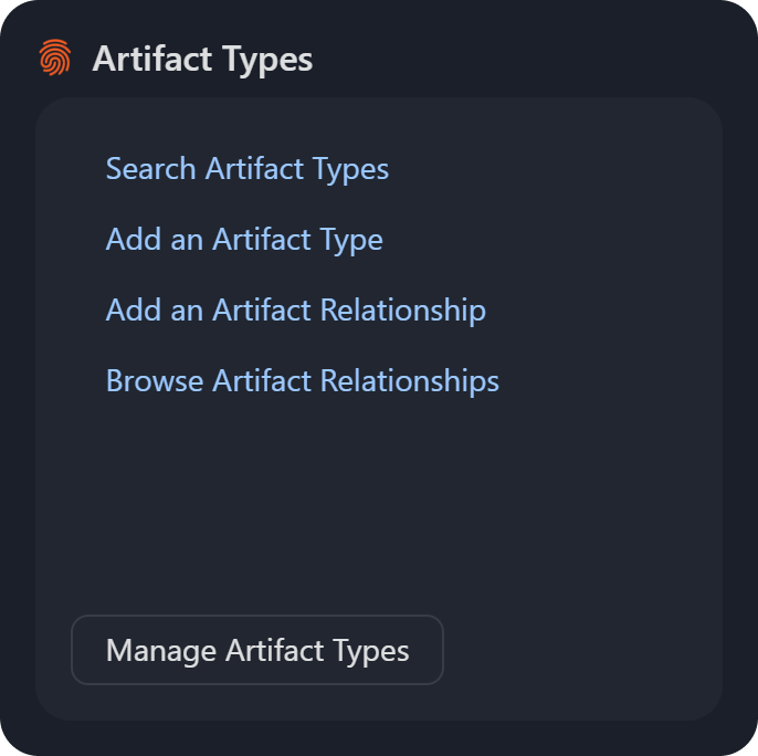 Artifact Types: The Search Artifact Types and Add an Artifact Type links direct users to the Artifacts module, with the latter opening the New Artifact Type popup for defining a new artifact. The Add an Artifact Relationship link opens the Relationship popup for configuring relationships between artifacts, while the Browse Artifact Relationships link navigates to the Relationships panel to view existing artifact relationships.