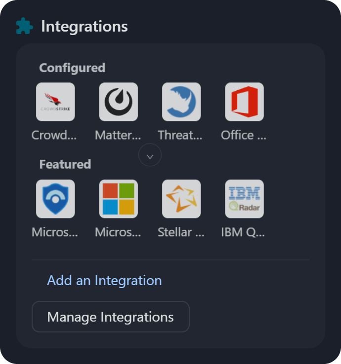 Integrations: Displays configured and featured integrations. Hovering over any integration displays a tooltip with an introduction. Clicking the Add an Integration link redirects users to the Integrations module with the Add Integration form.