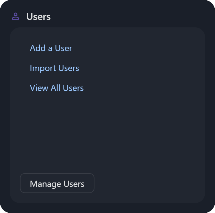 Users: Options include adding a user, importing users, or viewing all users. These links redirect to Organization Management > Users.