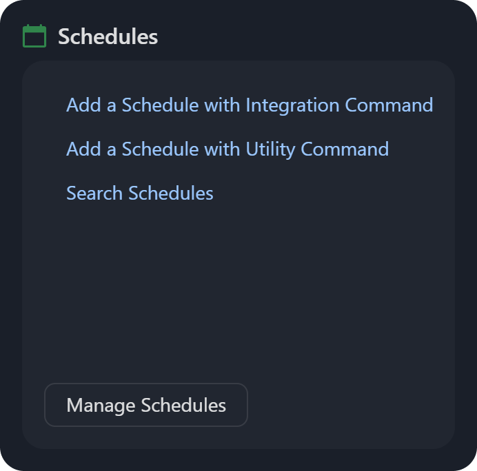 Schedules: Users can add schedules with integration or utility commands, or search schedules via the Schedules module.