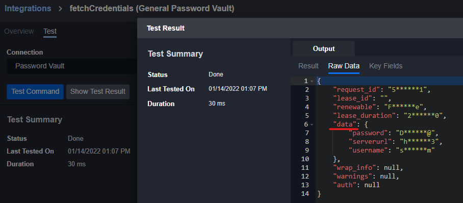 $.dataNote: Different password vault could have different root JSON paths. In order to identify the root JSON path of a given password vault, test the "Fetch Credentials" command to check on the response payload for the JSON path structure.