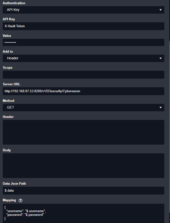 D3 SOAR integrates with external credential vaults, which enables you to use them in D3 SOAR without hard coding or exposing the credentials of third-party applications (SIEM, EDR or Threat Intel). The credentials are not stored in D3 SOAR, rather, the integration fetches the credentials from the external vault when called.