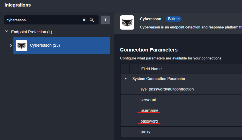 Follow the similar process of setting up a new integration connection (e.g., Cybereason)