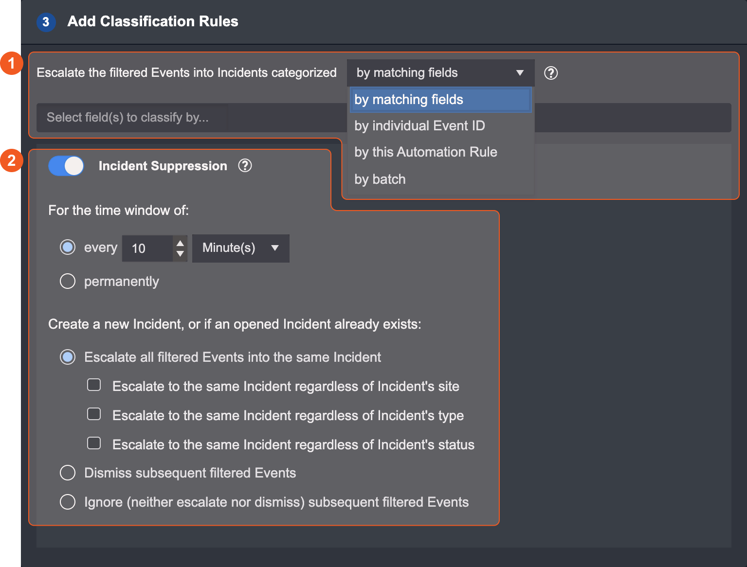 | Manages how events are handled within a specified time window. HIGHLIGHT Escalate all filtered Events into the same Incident Grouped D3 events are escalated into the same incident. However, once the site, type, or status fields of that incident changes, new D3 events that match the automation escalation rule will be escalated into a new incident – the "door" into the original incident is now shut. This direction change behavior can be suppressed, allowing new events to "break into" the original incident, by selecting the appropriate options: