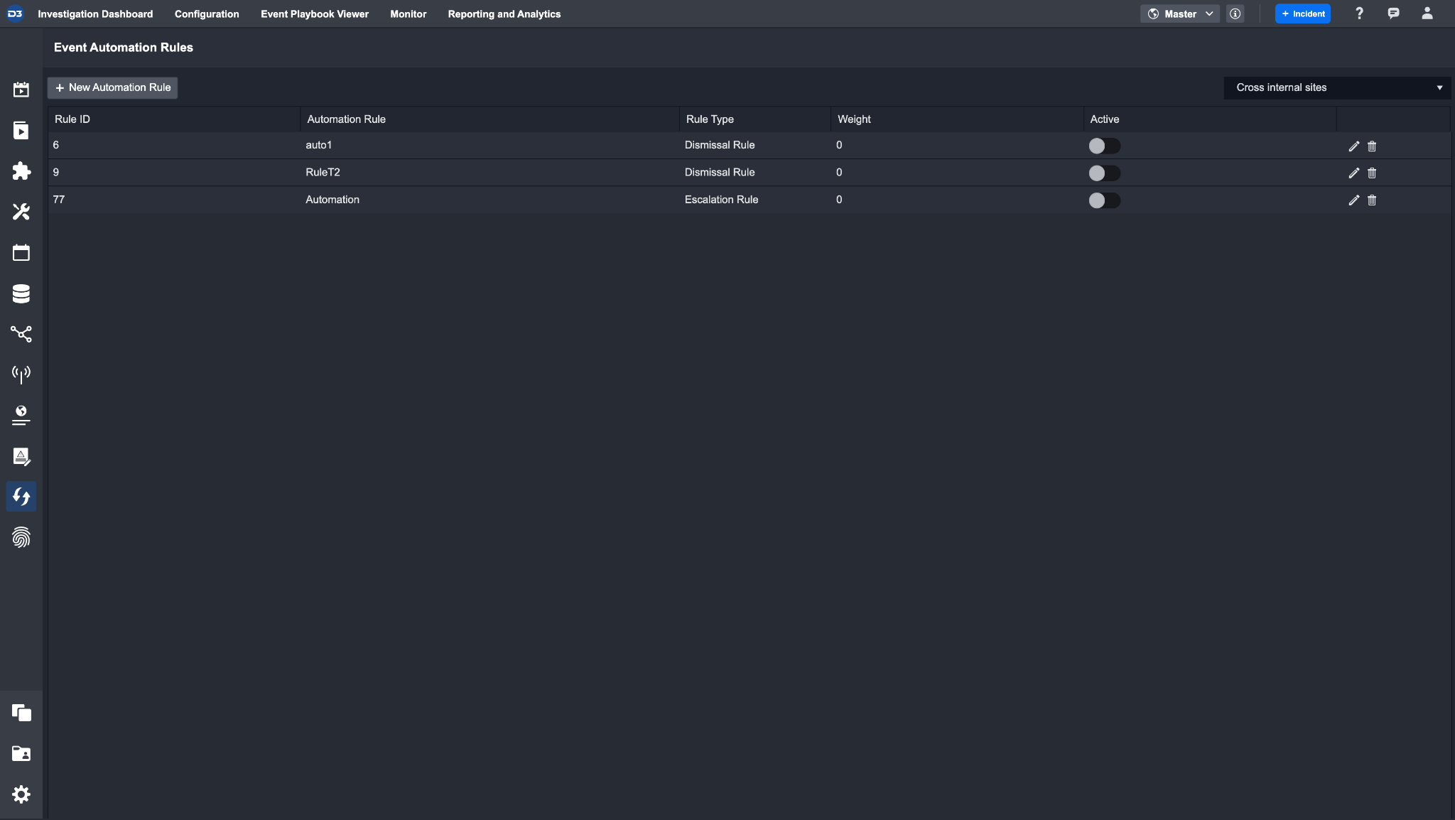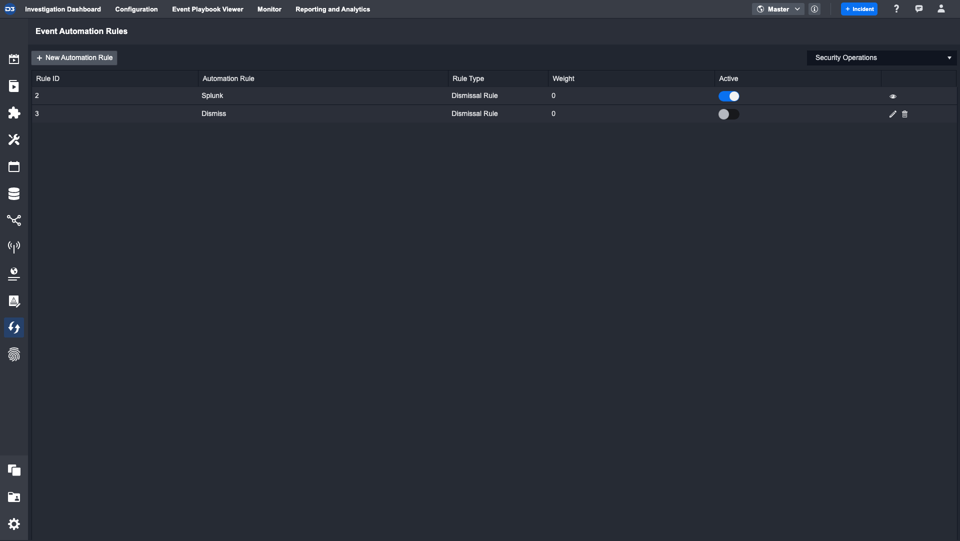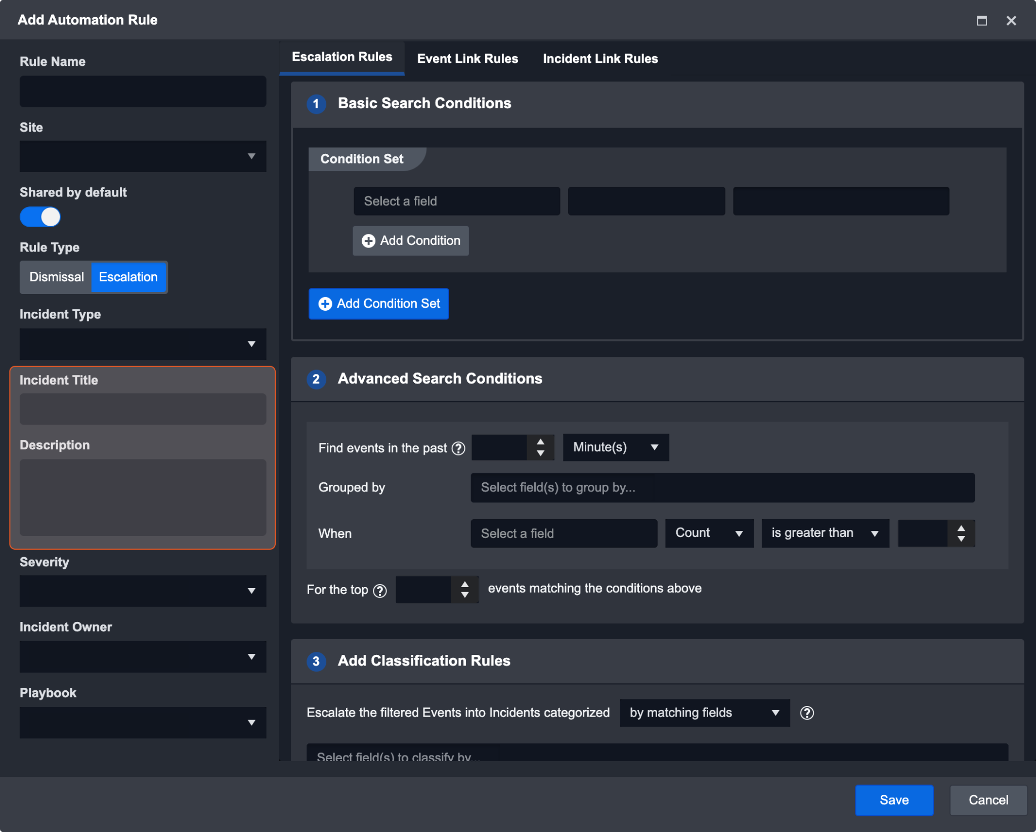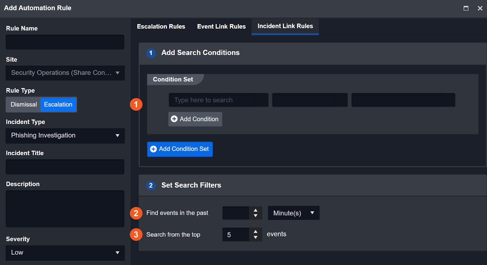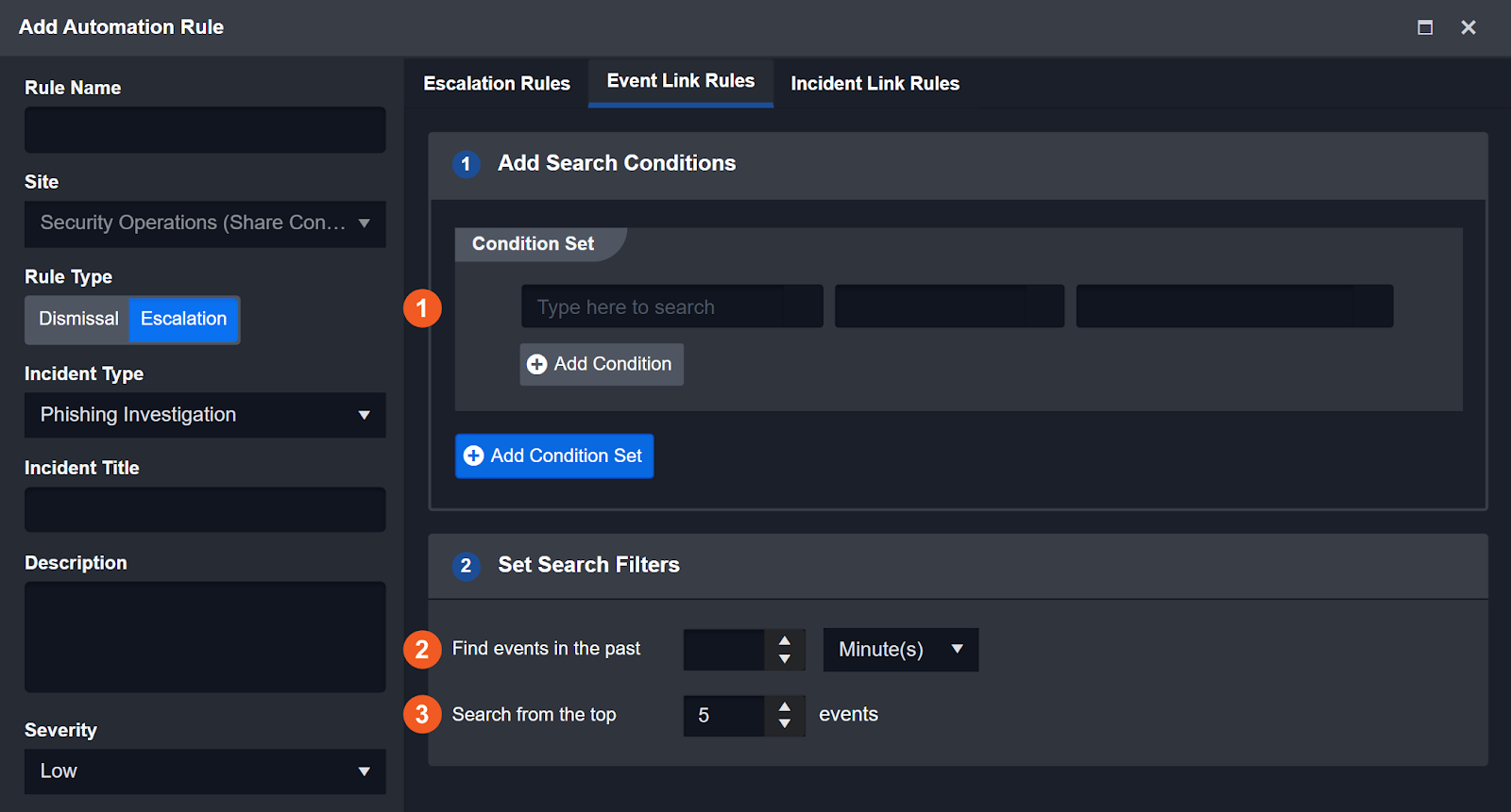 The Event Automation Rules module automates event escalation and dismissal based on predefined criteria. By setting conditions and linking related events or incidents, users reduce manual analysis of repetitive events and focus on investigation tasks.