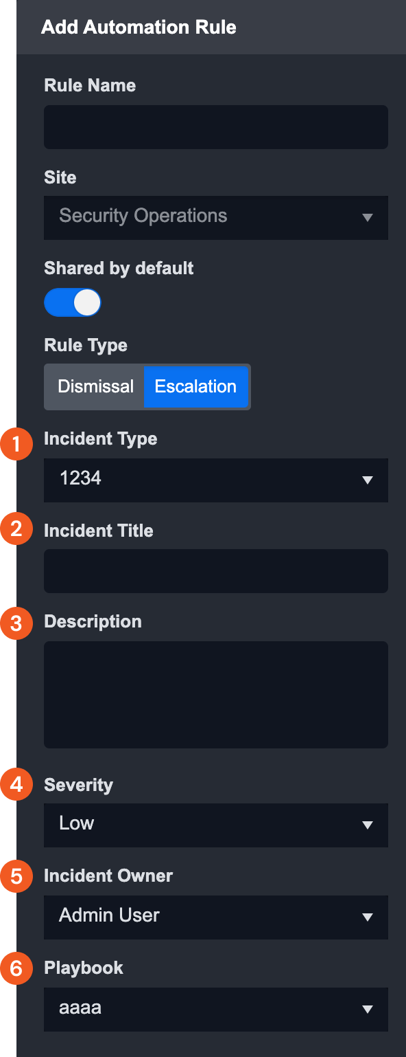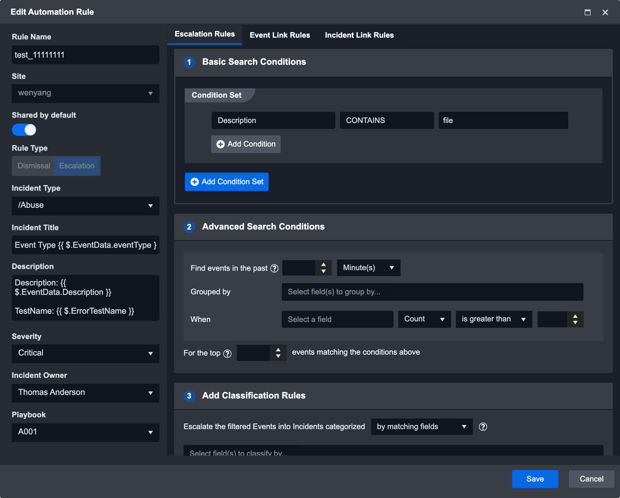 Additional incident fields are shown for the Escalation Rule:
