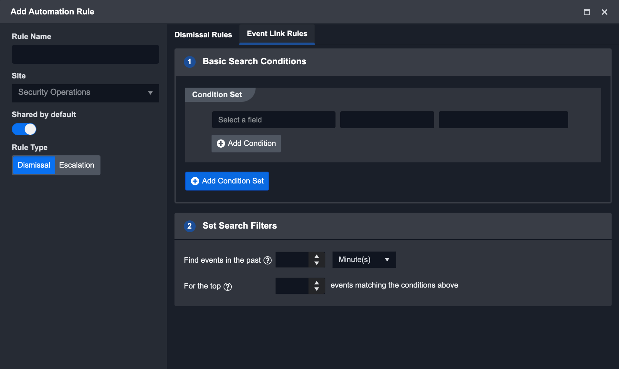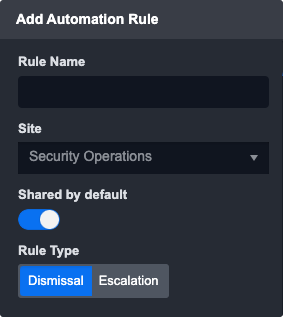 Automate the dismissal of events. When the Dismissal rule type is selected the following rule settings are provided: