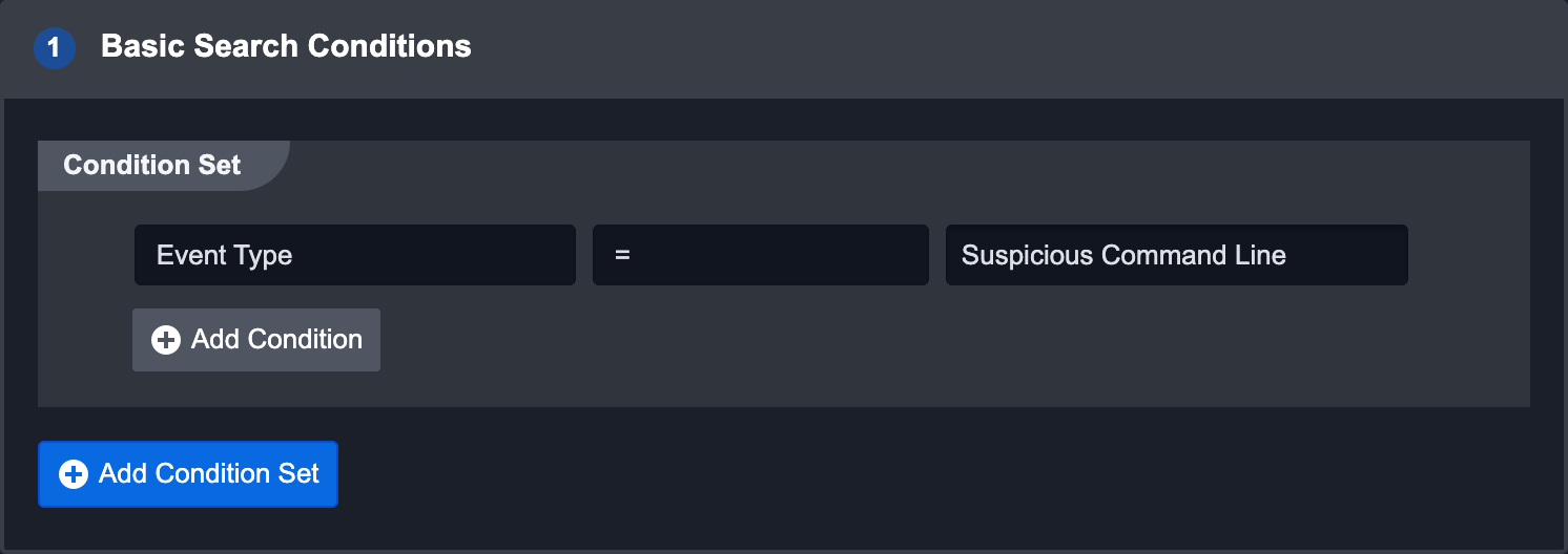 This search method applies custom Conditional Sets on ingested Events. For example, an event with the Event type "Suspicious Command Line" would satisfy the condition in the screenshot above. Adding another condition will create an AND condition that the event must also satisfy.