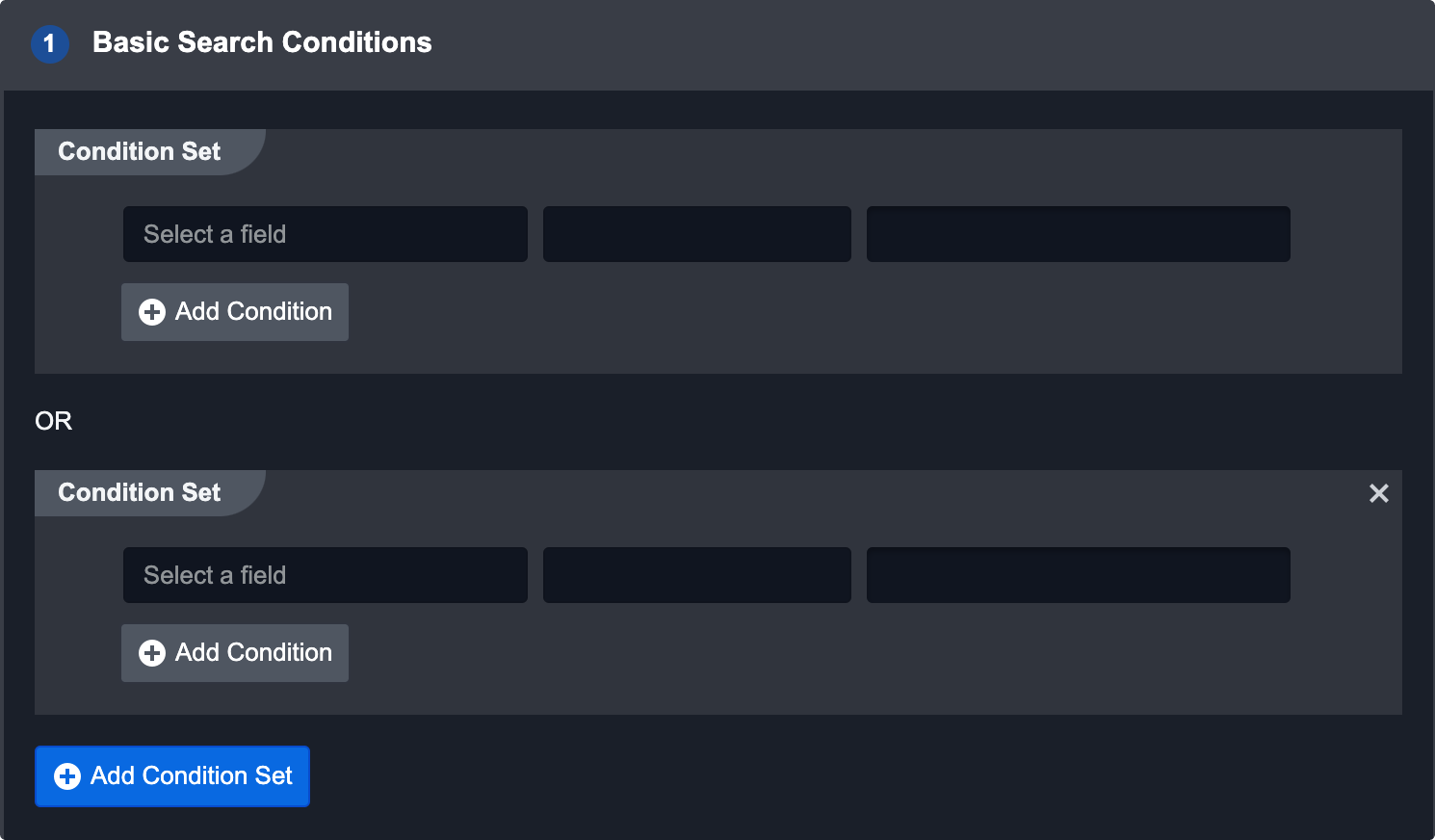 To add an additional set of conditions the event could satisfy, click the Add Condition Set button. This will create an OR conditional with the first set.