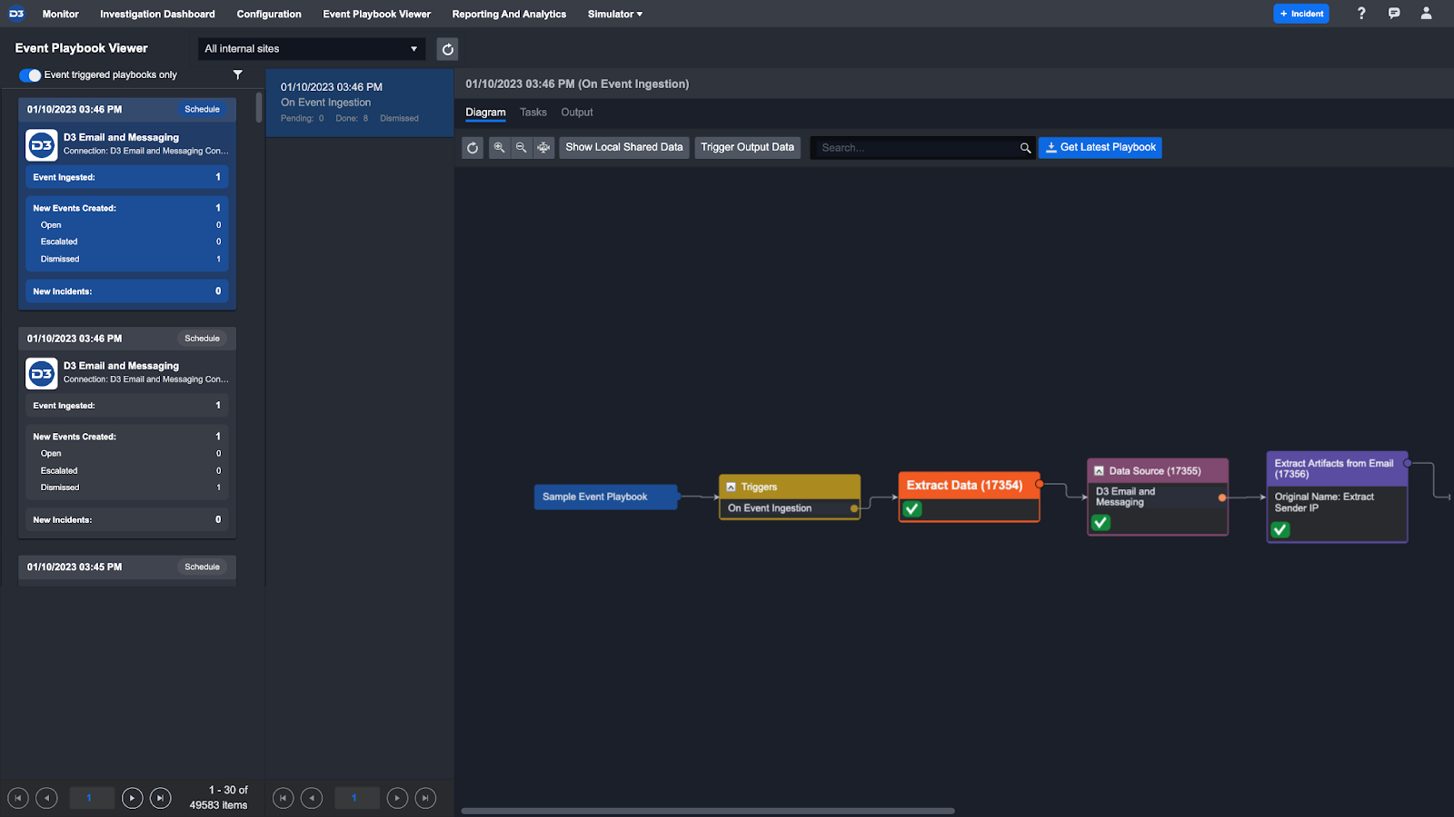 Event Playbook Viewer allows you to check the status of Event-triggered playbooks and the corresponding task details. There are two triggers—On Event Ingestion and After Event Dismissal—and a specific trigger determines the triggered task chain within the event playbook being executed.