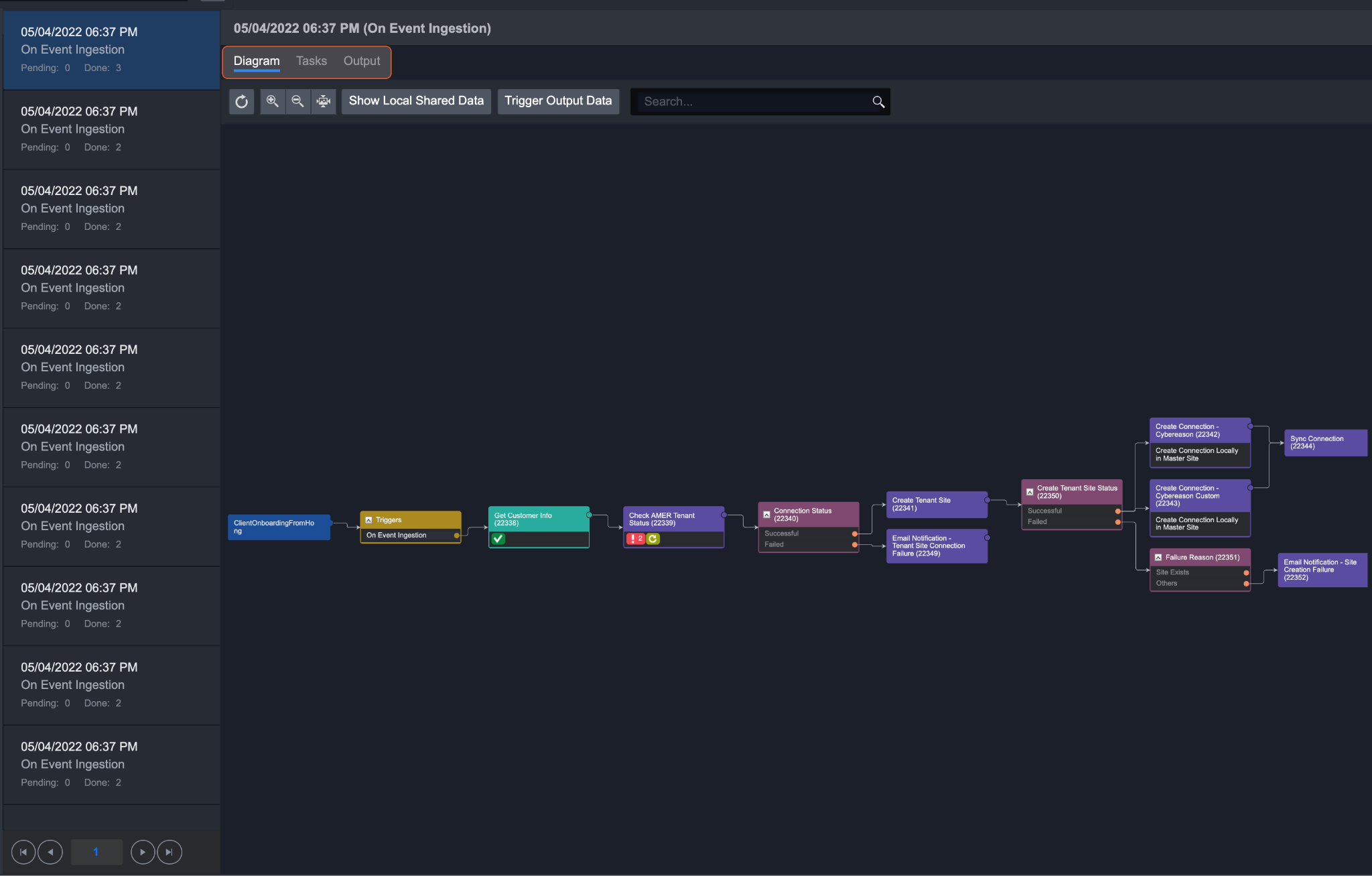 This panel displays an overview of the specific triggered task chain within the event playbook that was executed. For example, if you are viewing an After Event Escalation trigger log, you will only see the task chain that comes after the After Event Escalation trigger in that specific event playbook.