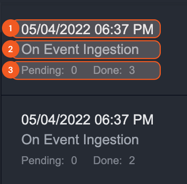 The trigger log lists all event playbooks that were executed. Each log represents a specific run of a triggered event playbook path – its details, which include: time of execution, the trigger, and status is displayed.