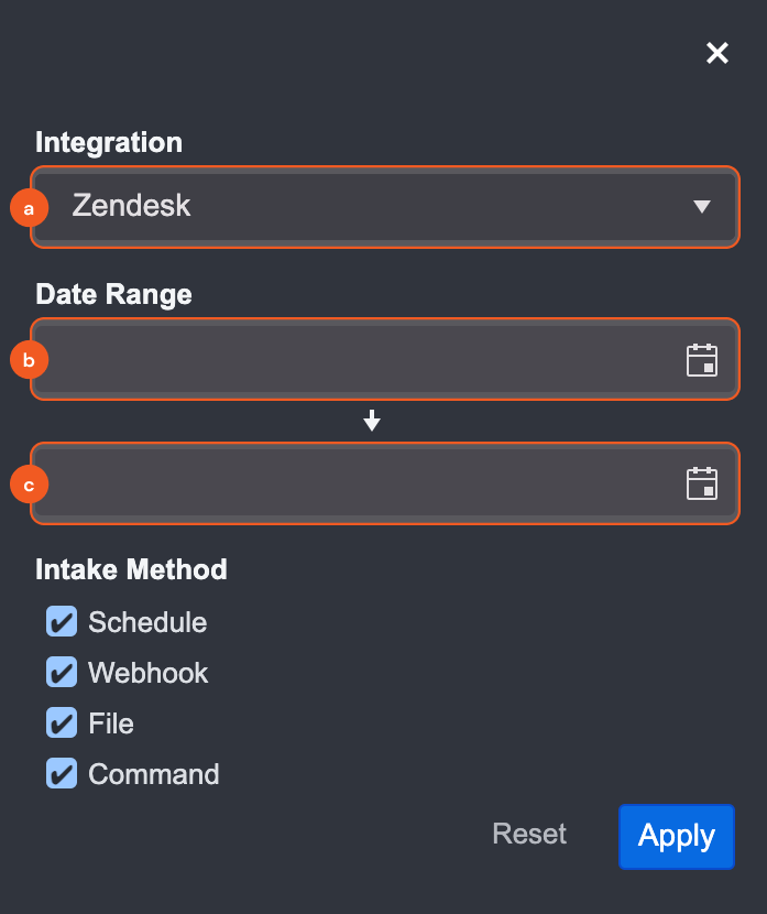 You can filter the ingested event data by Integration, Date Range and Intake Method.