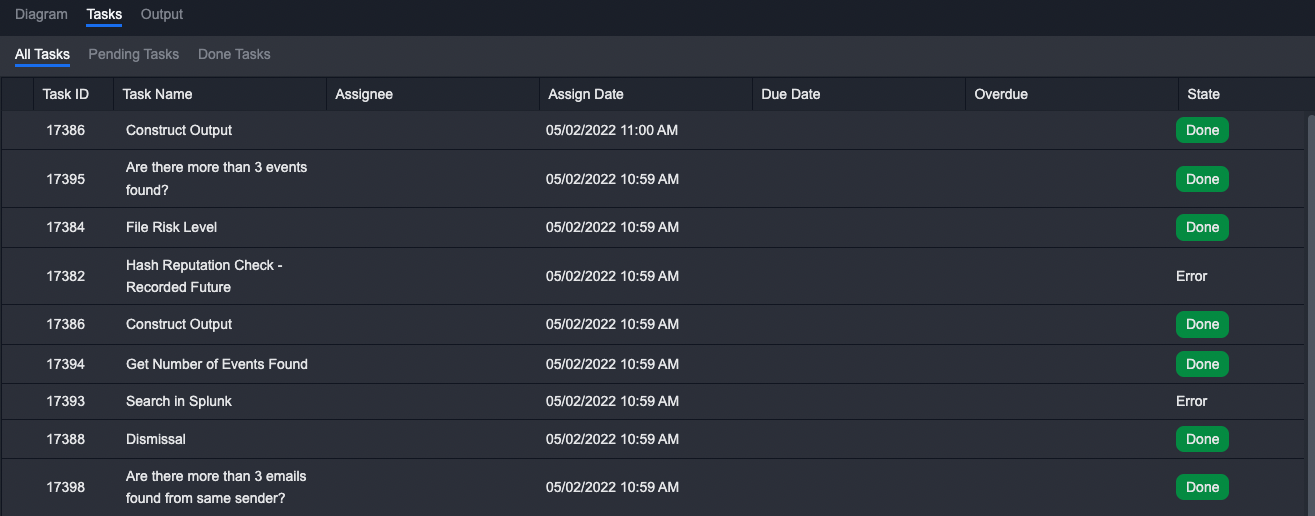 This tab shows all the tasks of an event Playbook and is categorized into three sub-tabs: All Tasks, Pending Tasks and Done Tasks. To correct an erroneous task, click on the specific item to open the Task Details window and click on the Rerun button to address the error before you run the error task. Under the Pending Tasks tab, there are required and suggested tasks. The required tasks require manual user input while a suggested task is optional.