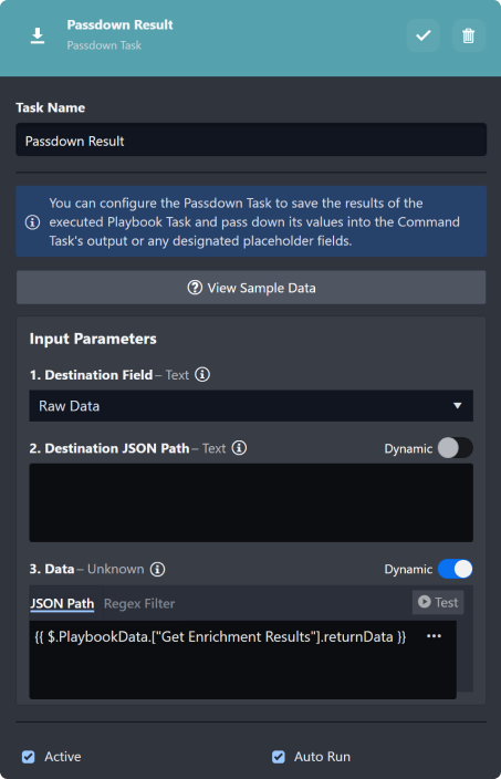 Add a passdown command to the end of the playbook to set the output parameter Raw Data in Step 1 with content that has been constructed in the previous step. Note: The Passdown task type is only available in the Event Playbook.
