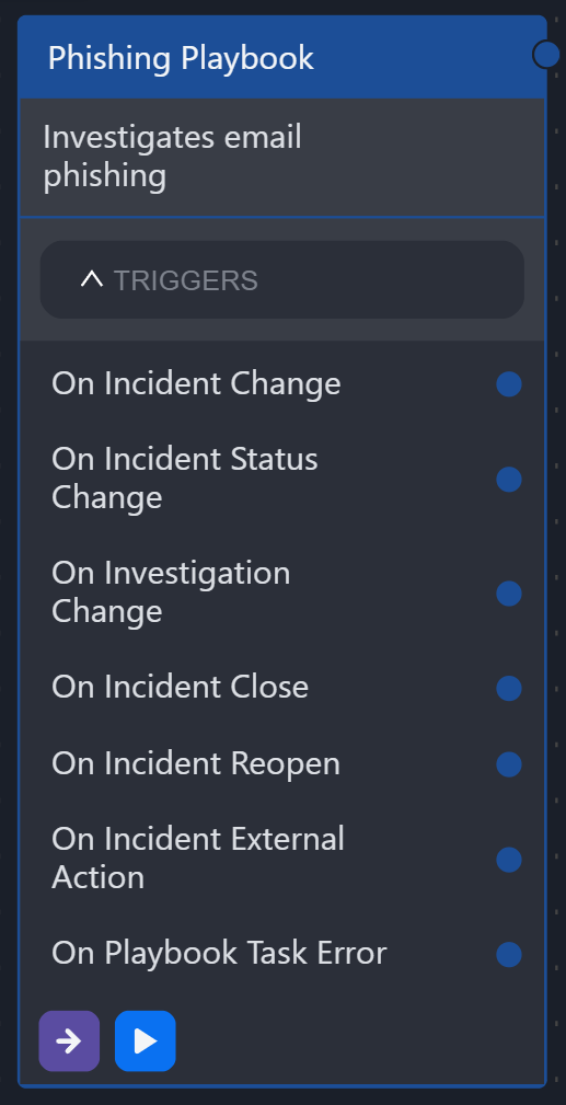 In an incident playbook, task chains can be connected to a trigger. In this case, each task chain is only run when the trigger condition is satisfied. Currently, incident playbooks have four triggers: