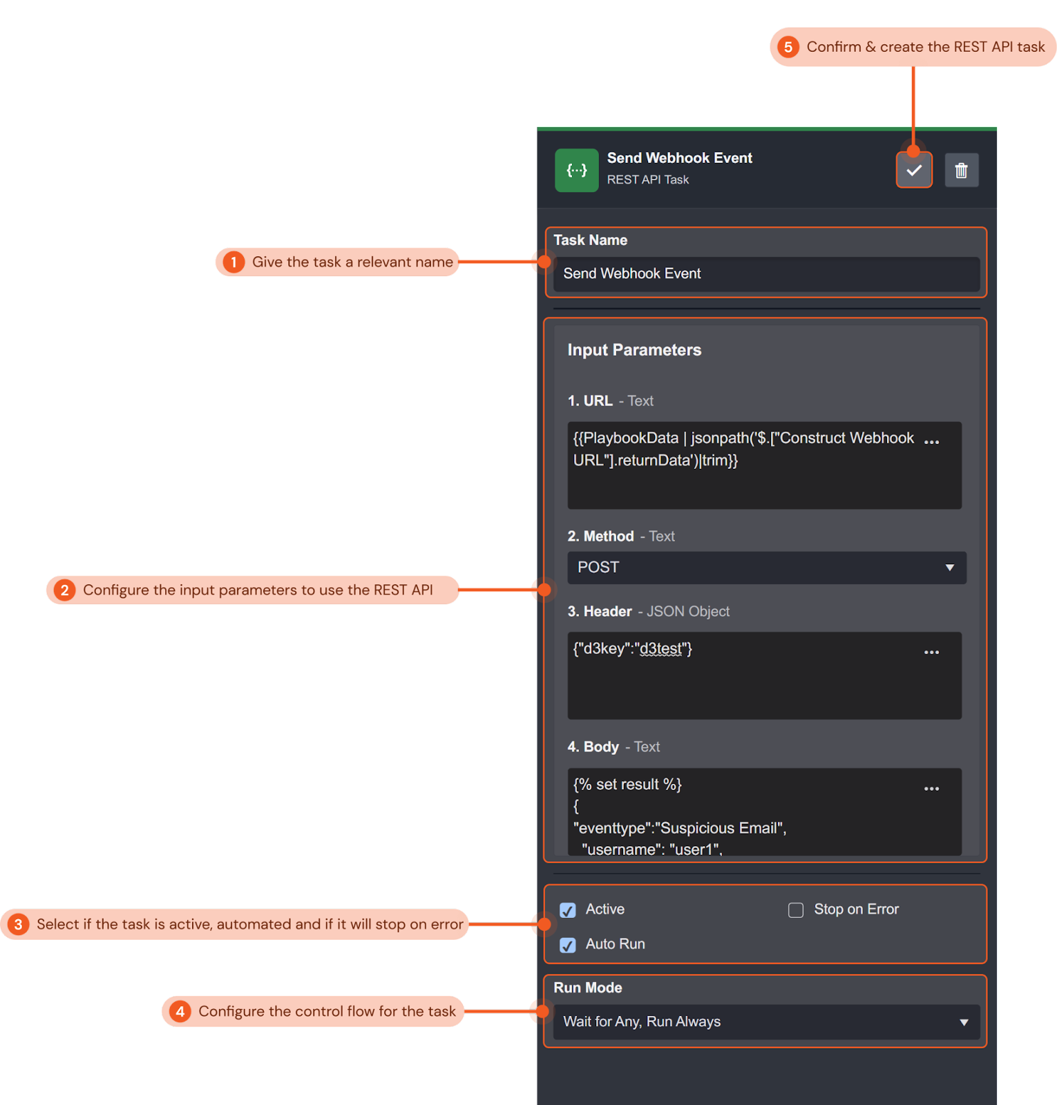 In this example, we will create a REST API task to send a webhook event to D3 SOAR with the POST method in order to create a new event entry.