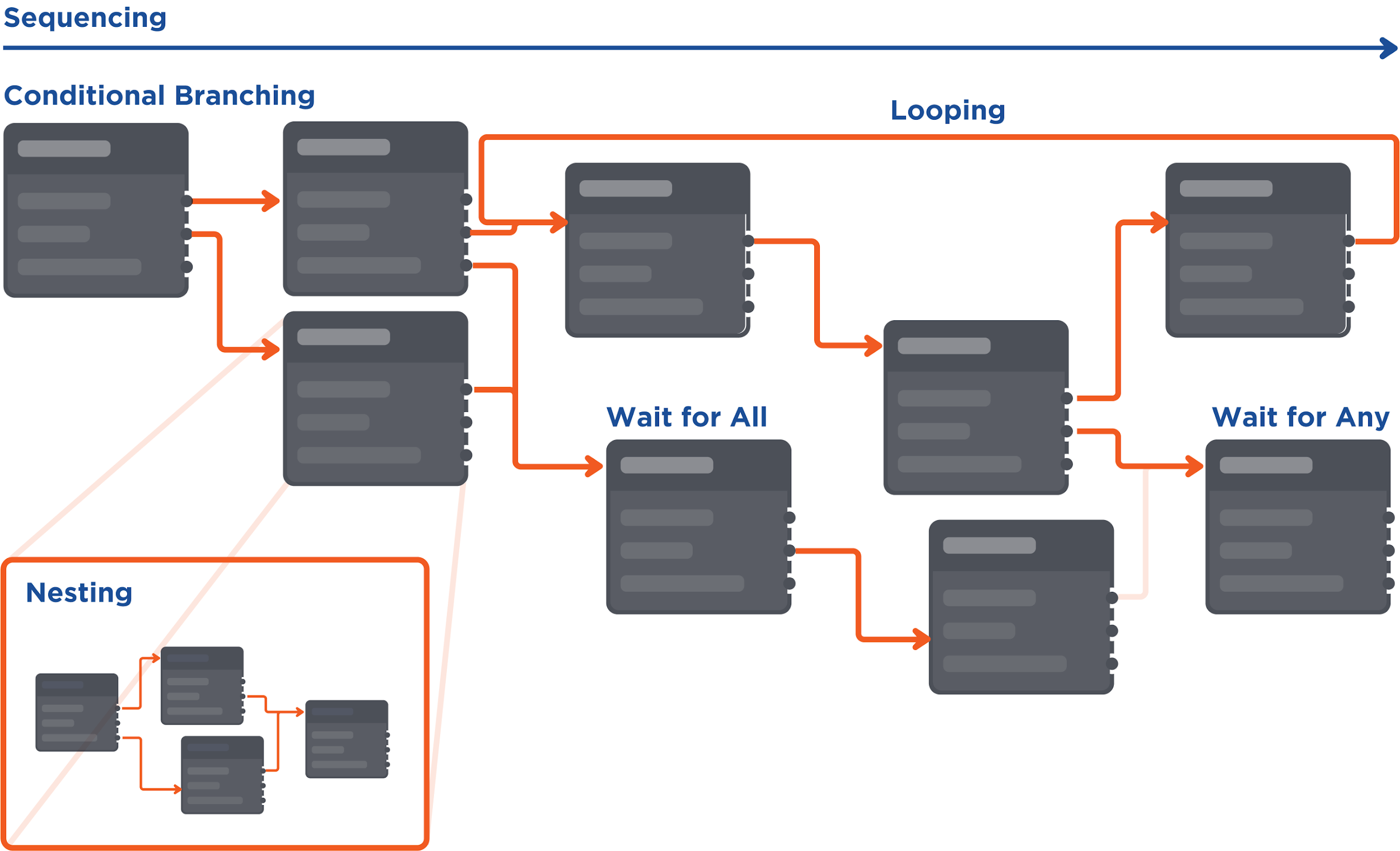 Starting from the source node, Tasks are run from left to right. You can choose to have different types of flow between nodes, including looping and conditional tasks.