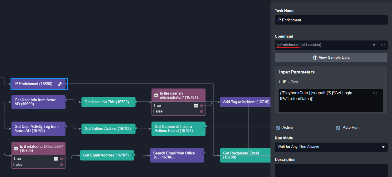 Within each command's input parameter, choose corresponding connection, make it "Active" and "Auto Run", and enable "Dynamic" JSON Path to {{ $.PlaybookData.DataSource.commandInput.ip }}