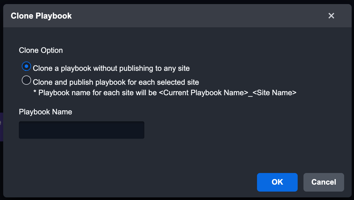 Clone PlaybookYou can reuse a Playbook within the same site with Clone Playbook. Cloning a Playbook can save time as the assignee within the tasks is preserved.