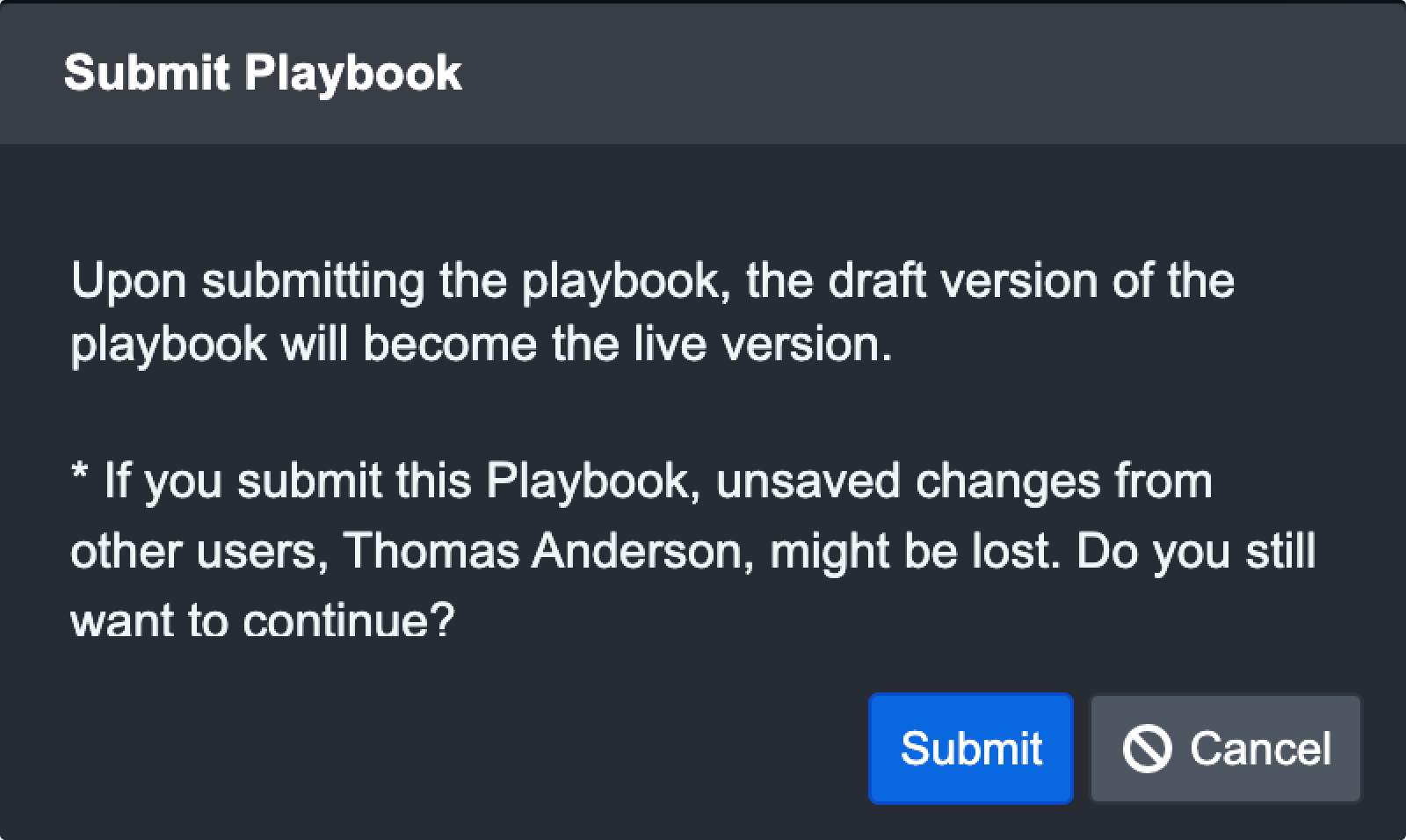 By default, all newly created Playbooks are in Draft mode. Once a Playbook is fully configured, you can switch the Playbook mode from Draft to Live by pressing the Submit button to solidify the changes.