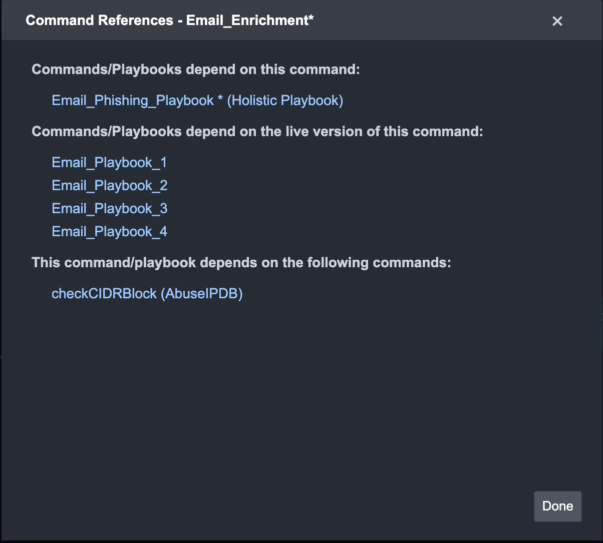 Command ReferencesThe Command References pop-up allows you to see the relationships between Playbooks and Commands. Command References are helpful when you want to see how your changes may impact the existing Playbooks that are used in a live environment. For instance, you can check: