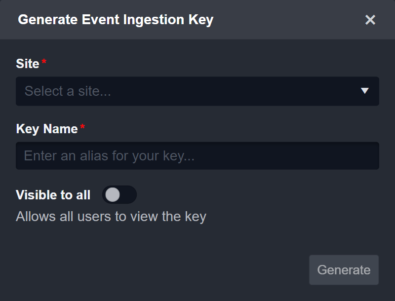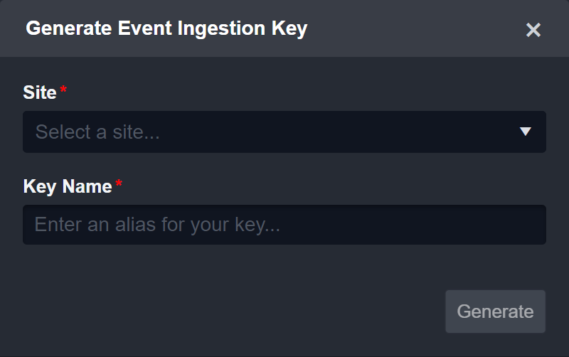 If you are generating a new key, select a site and enter an alias for your key. The selectable sites are limited by which section you have clicked + in the previous step. Click Generate.