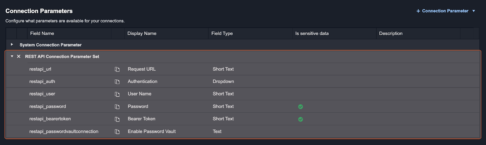 Result: The REST API Connection Parameter Set will appear in the table below.