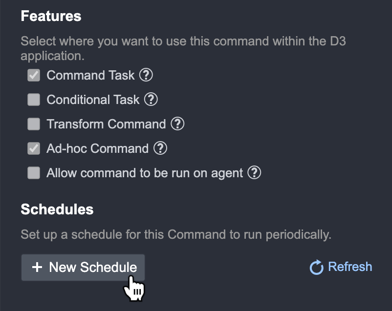 The Commands have no manual input. This means you can only select the following options under the features section - Command Task, Ad-Hoc Command, and Allow command to be run on agent.