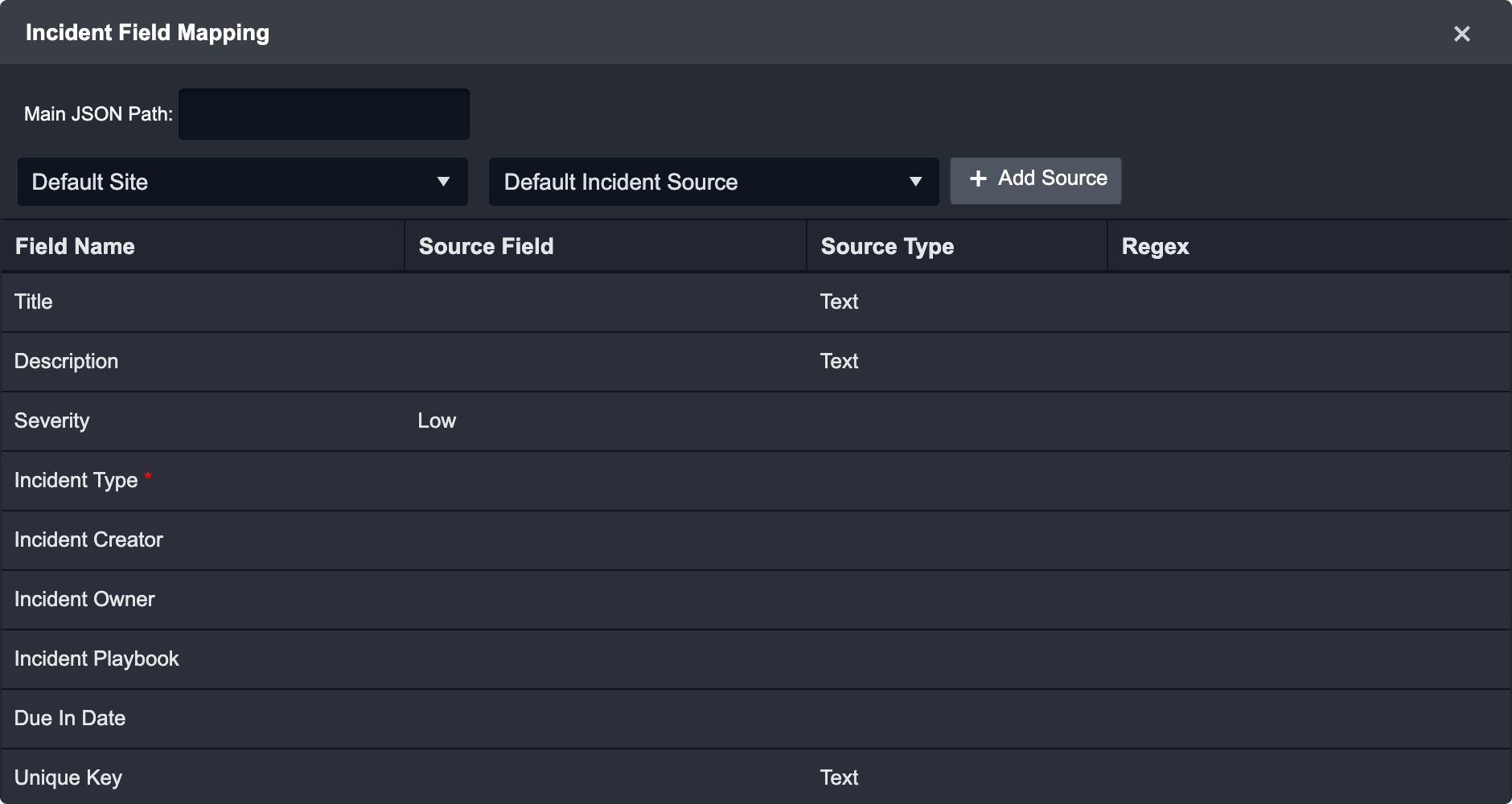 The File Ingestion method allows you to manually upload Event/Incident data into the system. The event/incident field mapping must be completed prior to the upload. For an incident file upload, you can optionally specify the event JSON path within the field mapping. If you do so, any events within the incident file will be created and linked to the incident after the upload.