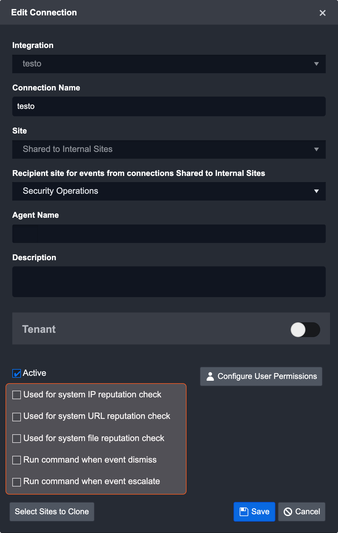 For all system commands added (except for Event Intake and Incident Intake), you will have to explicitly enable the functionality for each connection. The relevant checkbox will be added dynamically based on the System Commands that have been added for that particular Integration when creating or editing its Connection.
