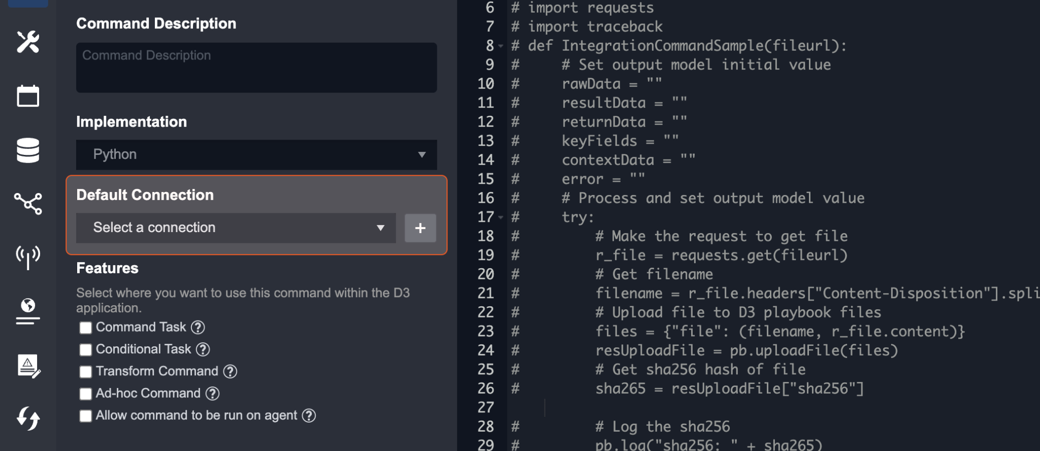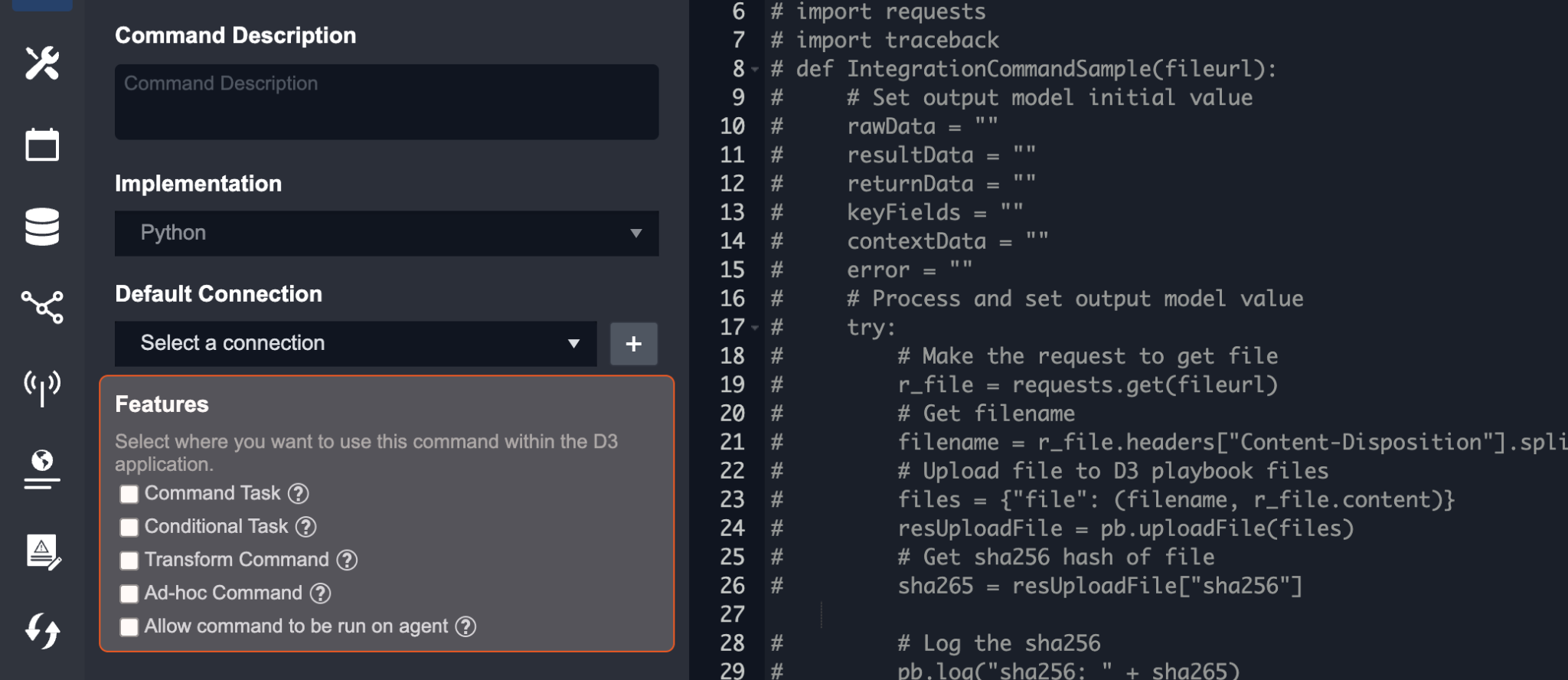 To build a Custom Command, you will need to configure the entire Command from scratch (ie, you will not be provided with any special attributes contained in System Command options). You have unlimited flexibility on implementing this Command with the Codeless Playbook, Python, REST API, or Database specific implementation options.