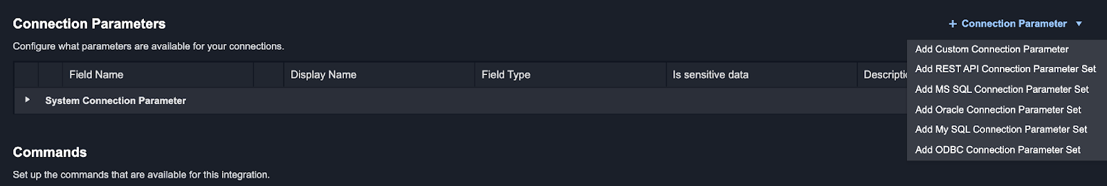 The Command parameters required to be created would be parameters such as Server URL, Username, Password, API Key, Version, and proxy.Database Specific Connection Parameter Sets