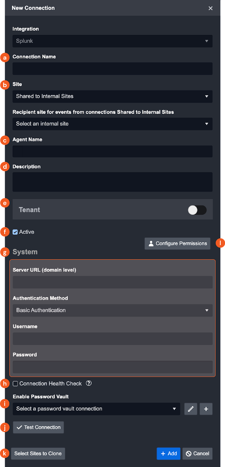 You will only have to add the Connection Details to begin using a system Integration. The following example shows the default configuration for a Splunk connection: