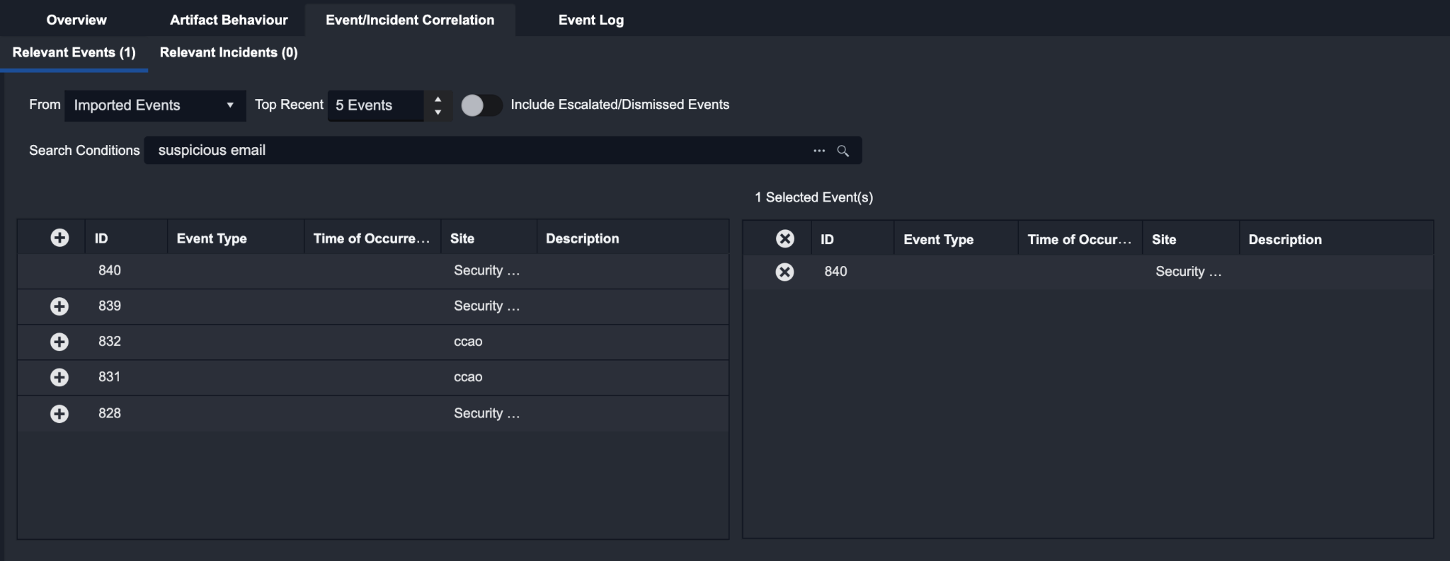 After filling out the rest of your search condition, the events that fit your criteria will be displayed in the table on the left. You can then select relevant events by clicking on the plus button. The selected events are then displayed in the table on the right. Once you've selected all the relevant events, you can perform a group escalation by clicking on the Escalate button. An incident will be created with all the relevant events linked to this incident. If you wish to escalate multiple events to existing incidents, please continue to the next section: Relevant Incidents.