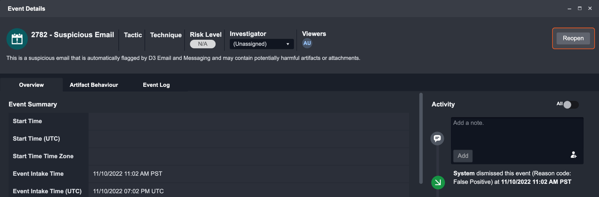 Dismissed events will appear in the All Dismissed tree view in the Events List. However, after an event has been dismissed, you can reopen it by clicking on the Reopen button in the event details header.