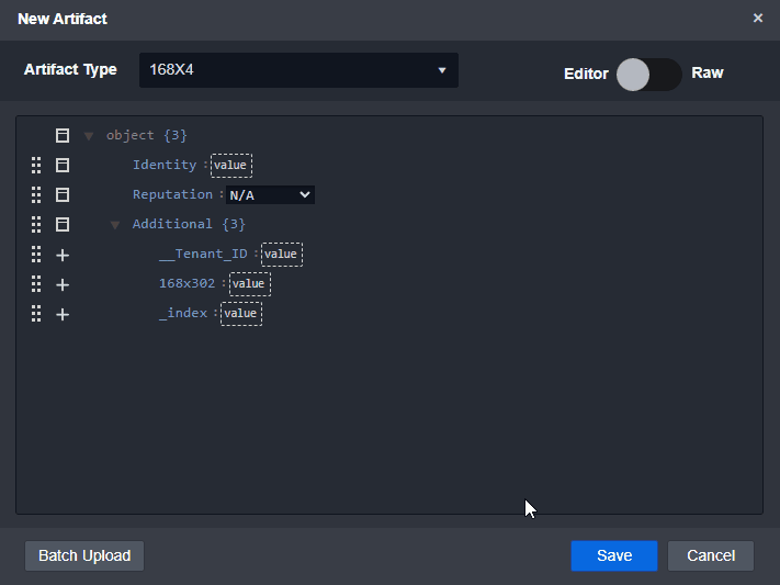 The editor view provides a more visual interface for adding new artifacts. It allows users to input values manually, select options from dropdown menus, and perform other interactive actions.