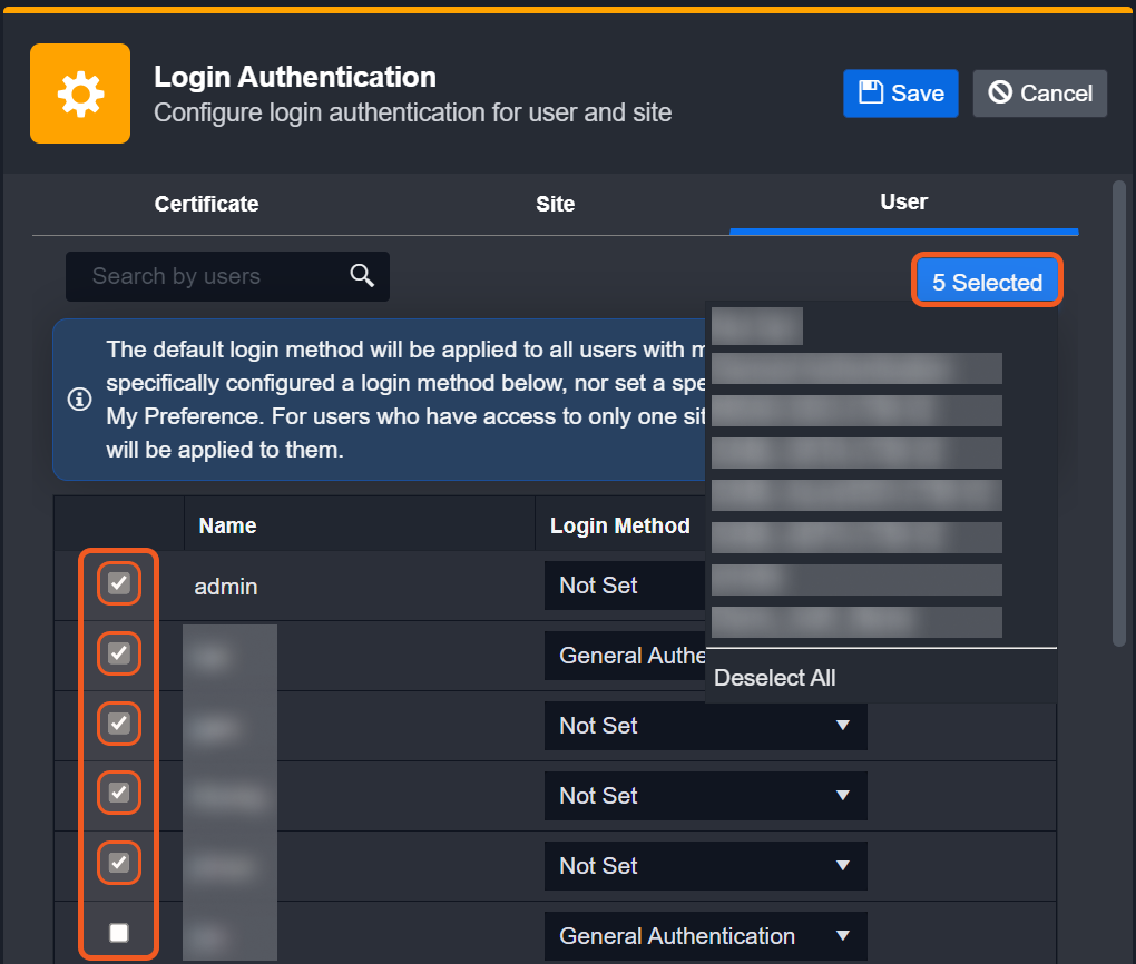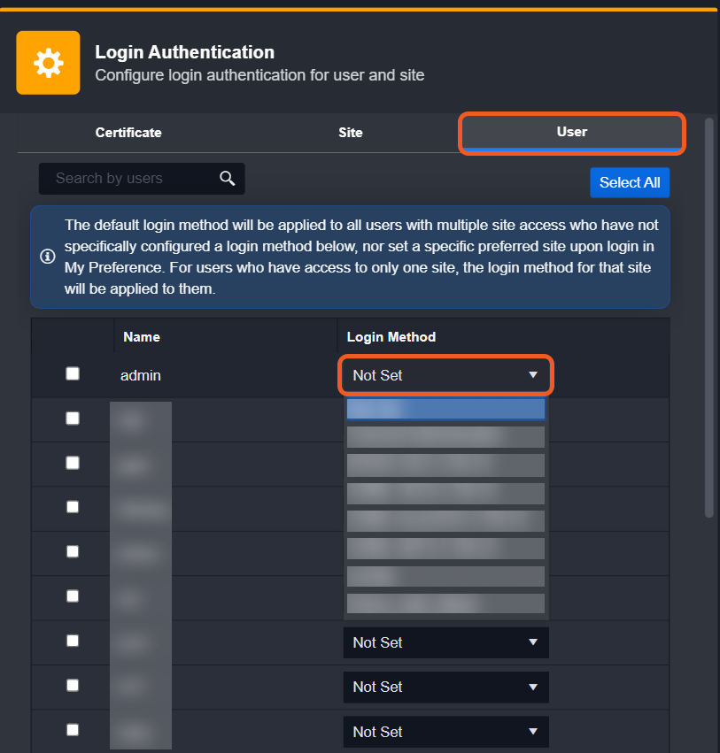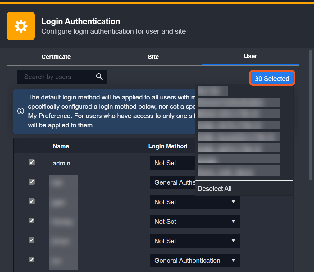 You have the option to select multiple users individually, or to select them all at once. If no Login Method is selected, the default login method will be applied to all users.