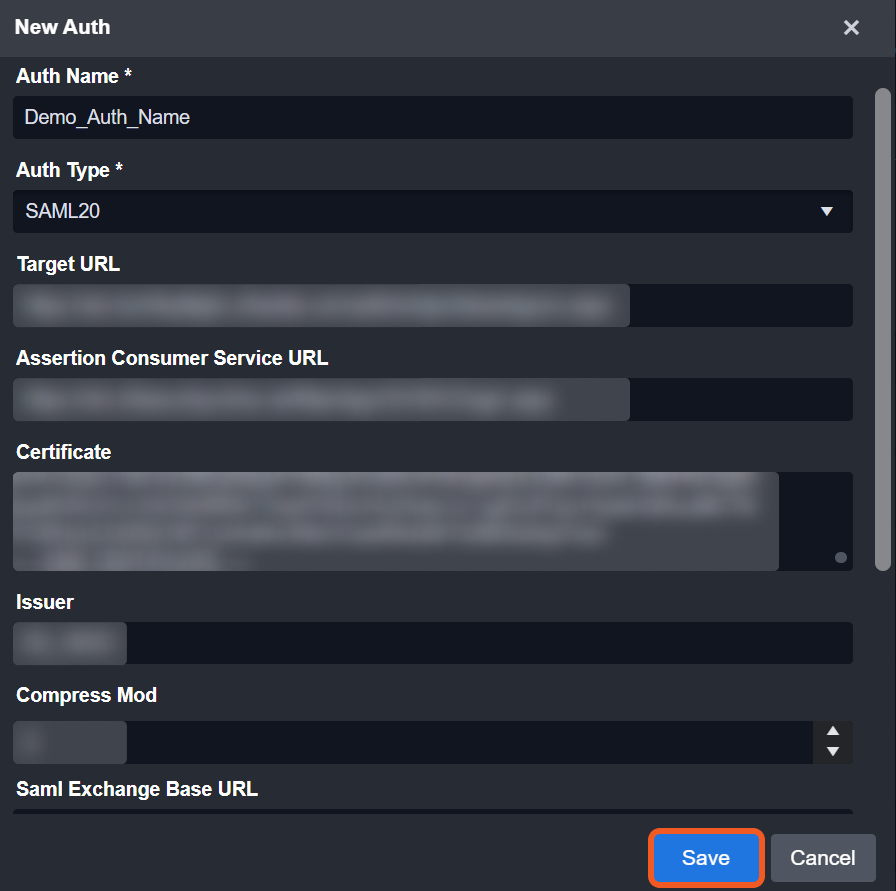 Click on the + New Certificate button to to render the New Auth form popup.