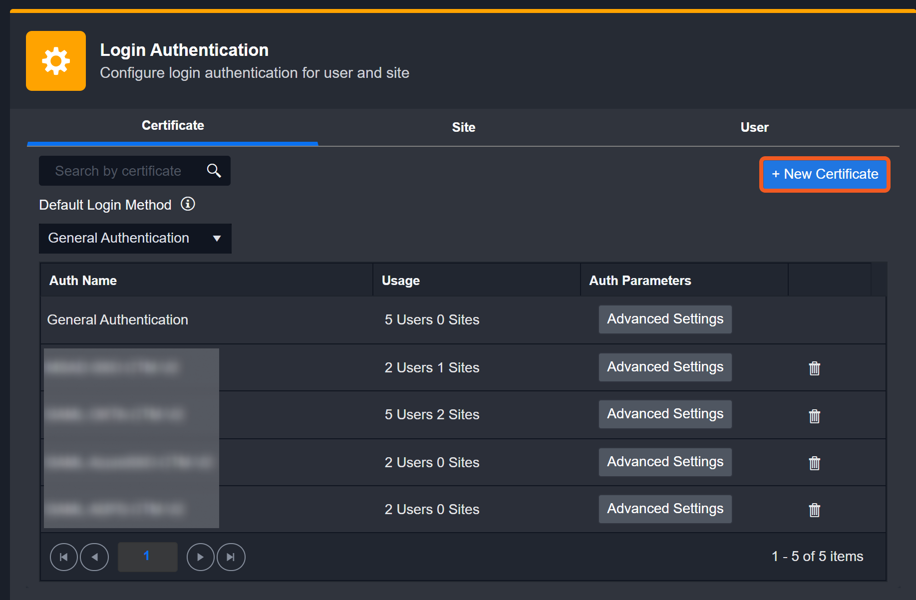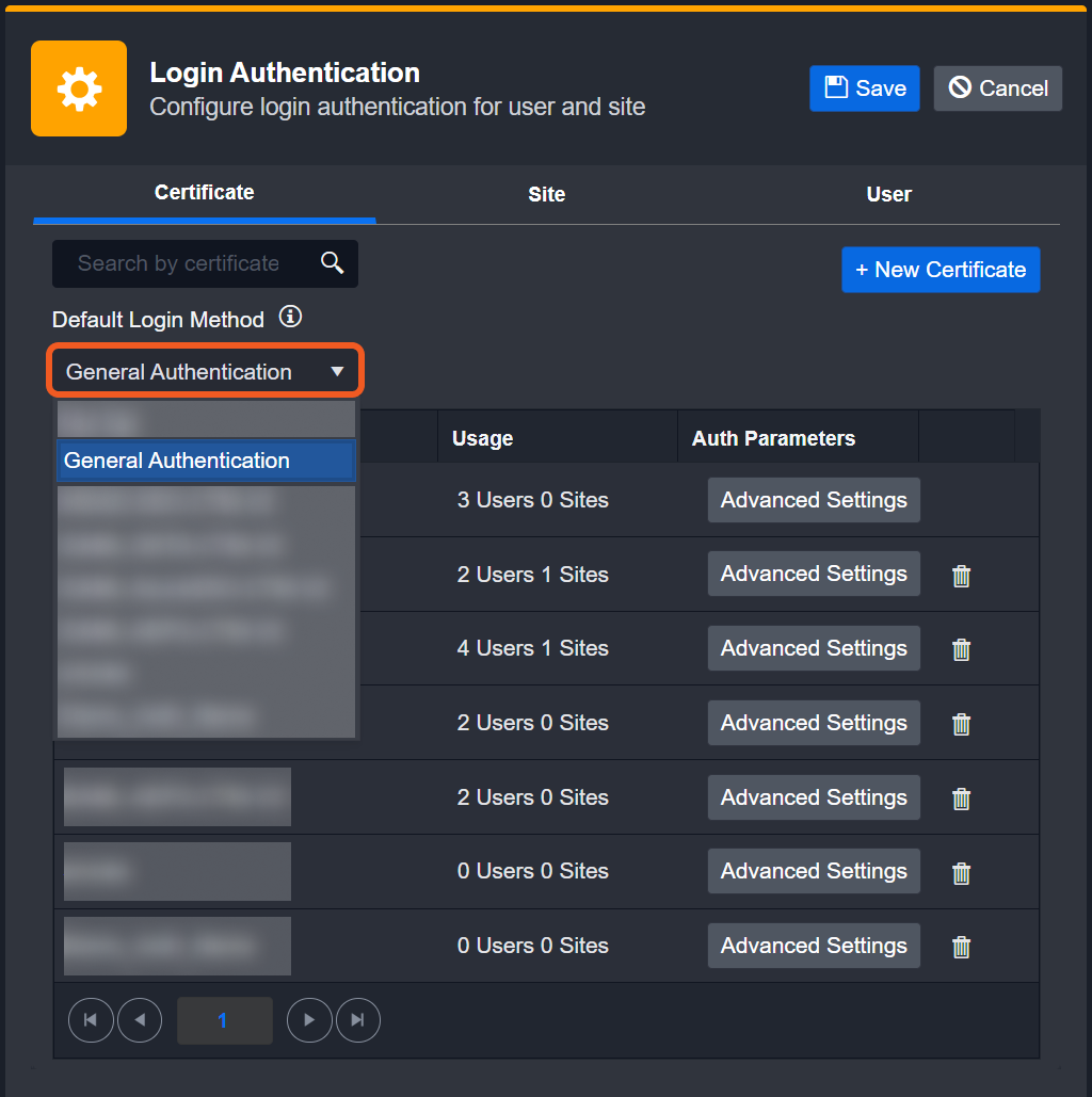 The table within the Certificate tab displays all of your configured login methods, with columns for Auth Name, Usage, and Auth Parameters.