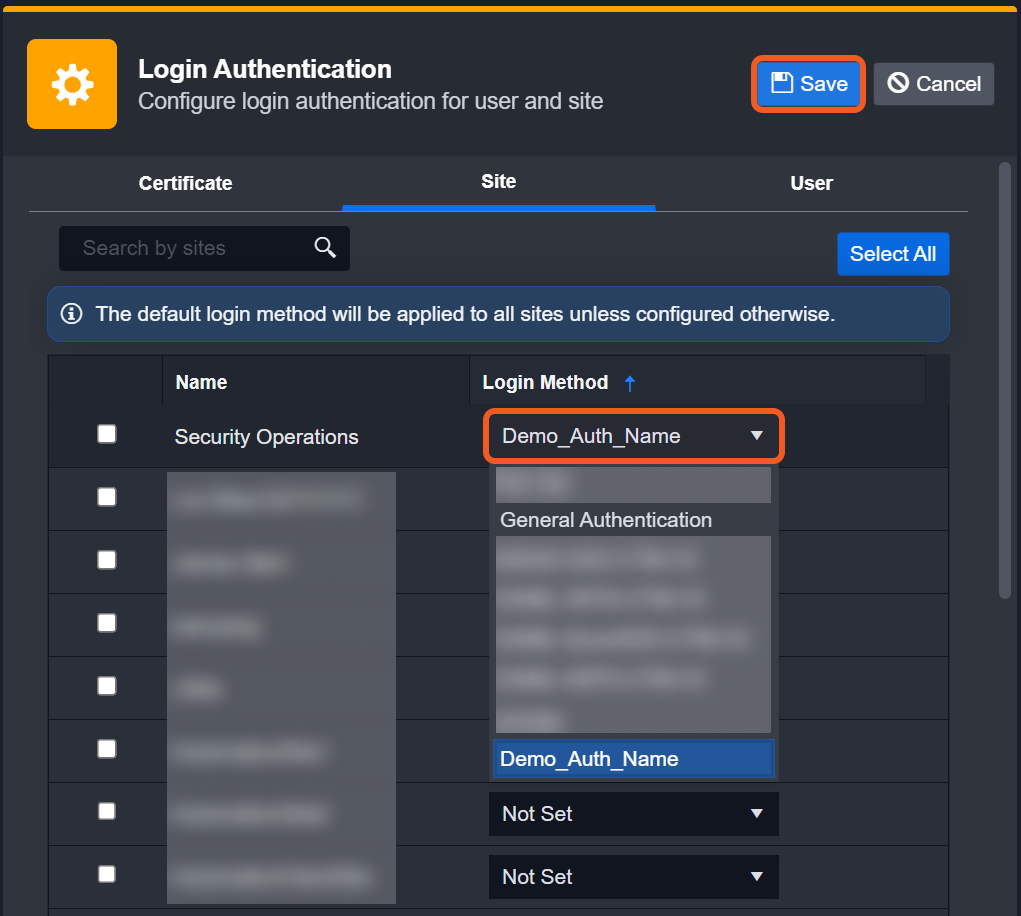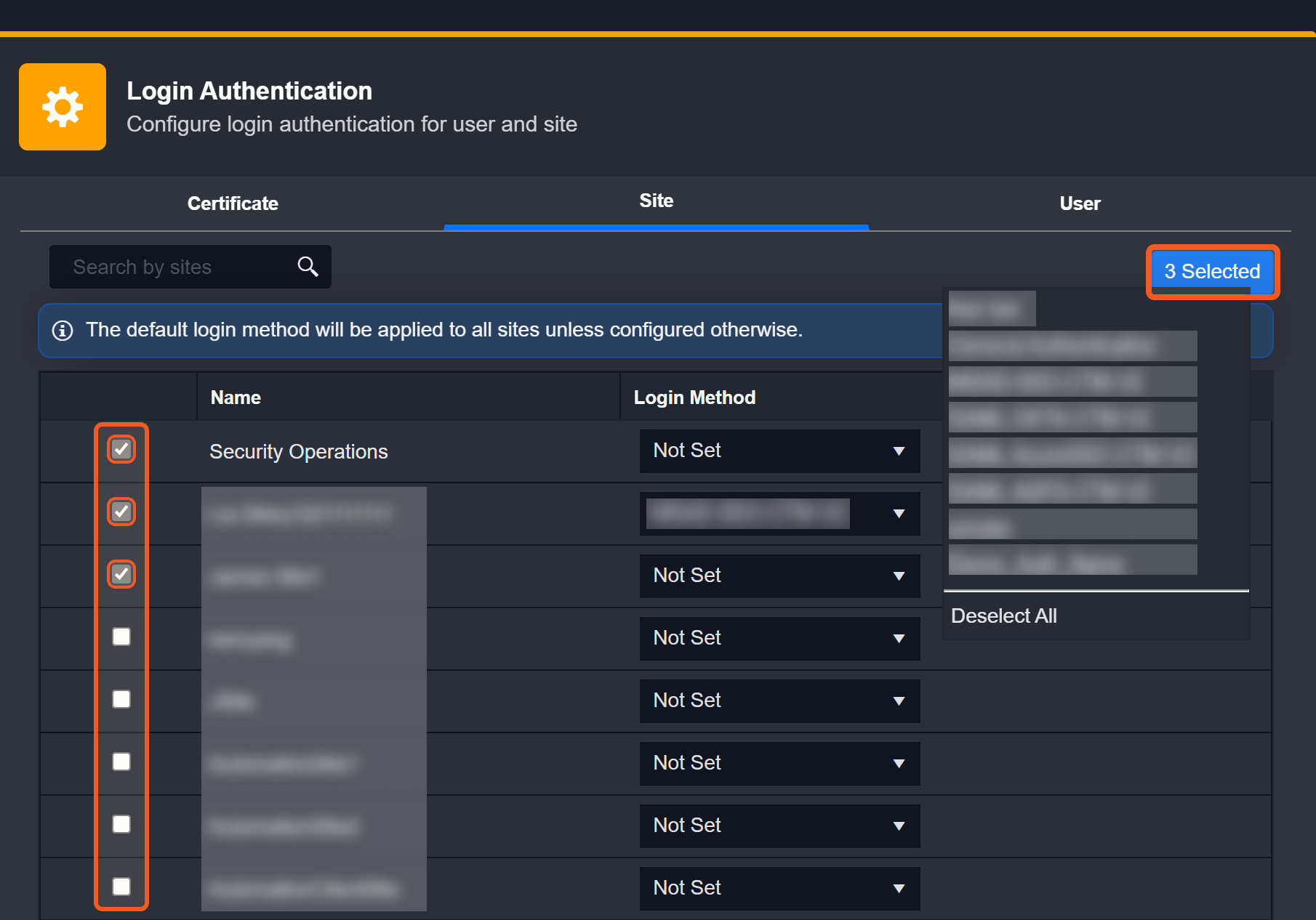 You have the option to select multiple sites individually, or to select them all at once. If no Login Method is selected, the default login method will be applied to all sites.