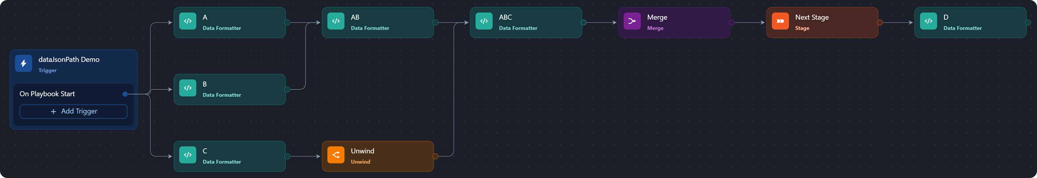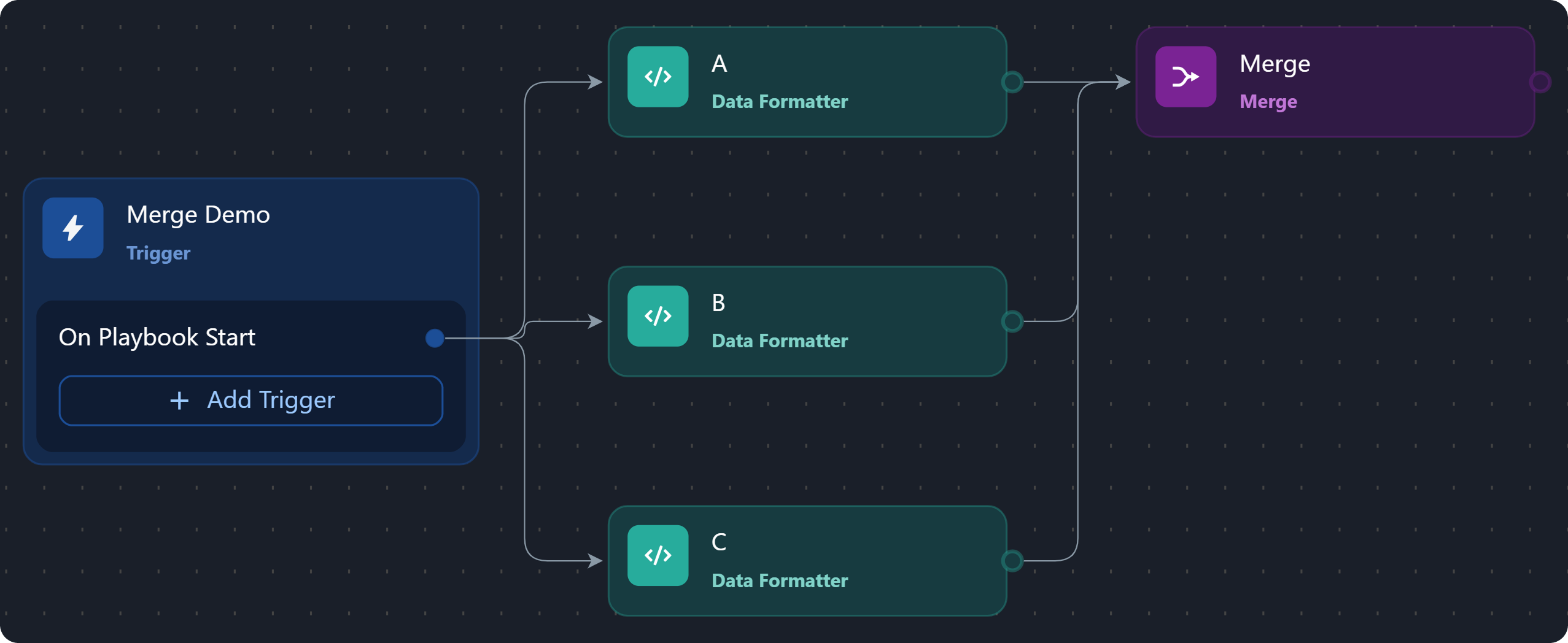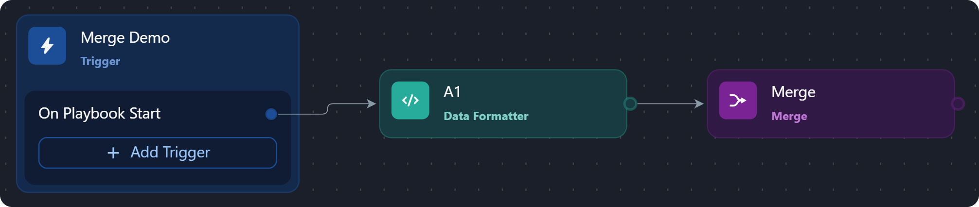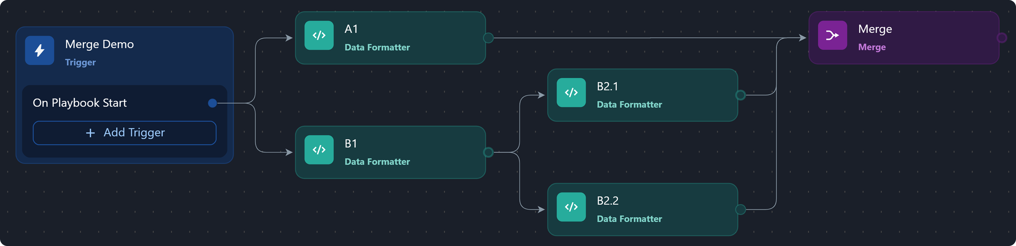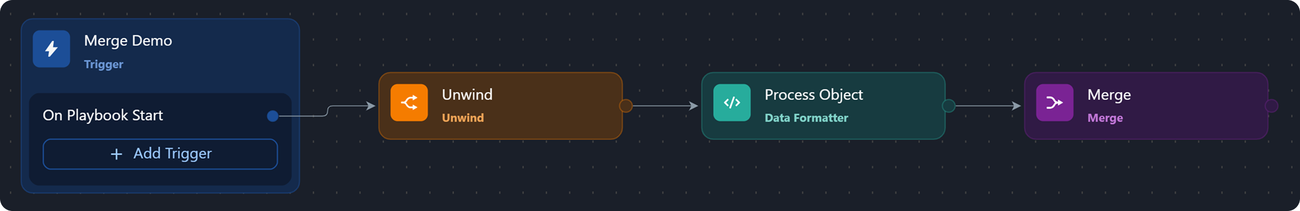 The merge condition is a JSON object that tells the system how to group data based on a shared lineage—such as by Playbook Instance, Task, Task Instance, or Path—(lineage grouping), which data to filter, and the required match count for producing the merge result.