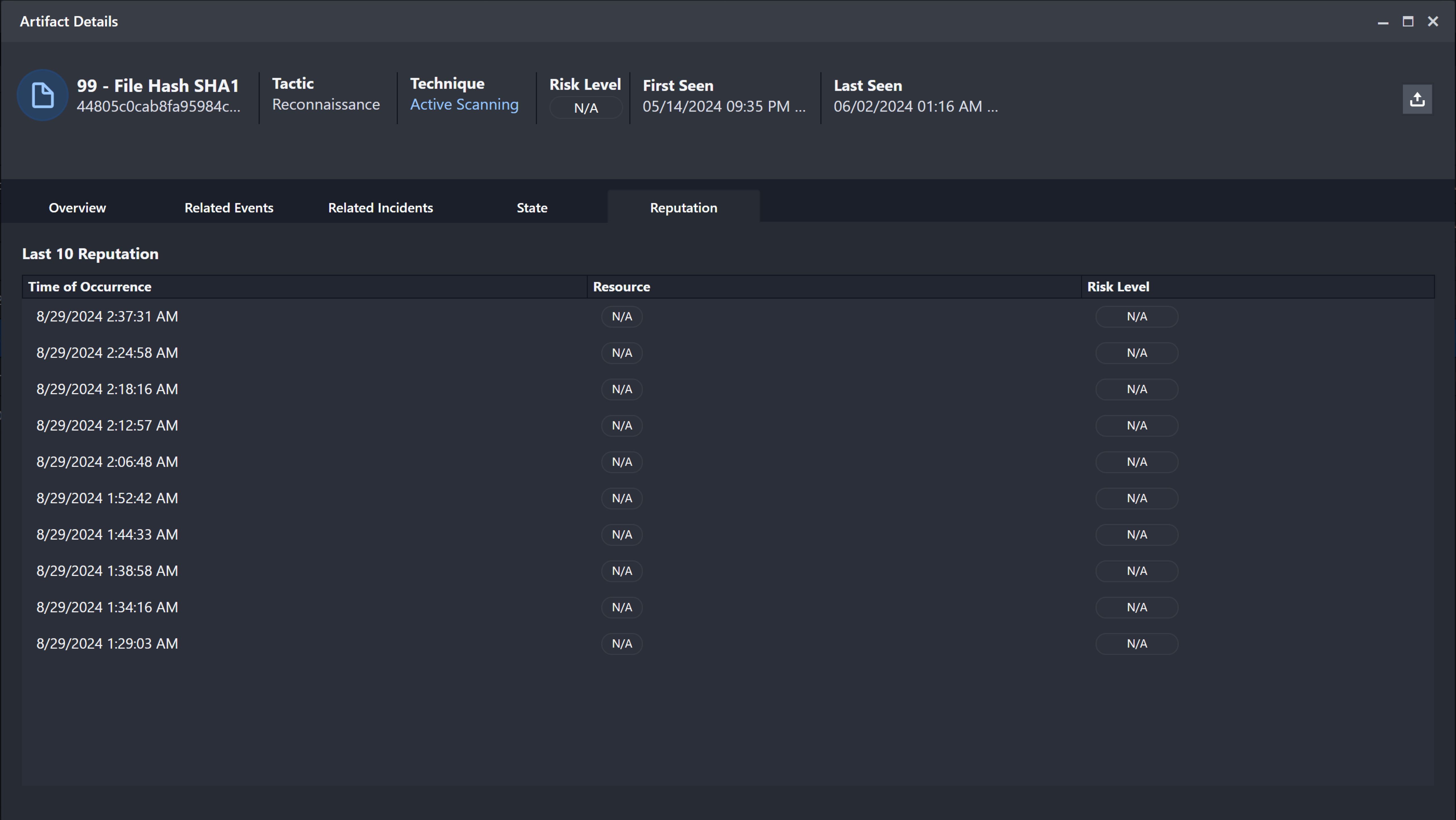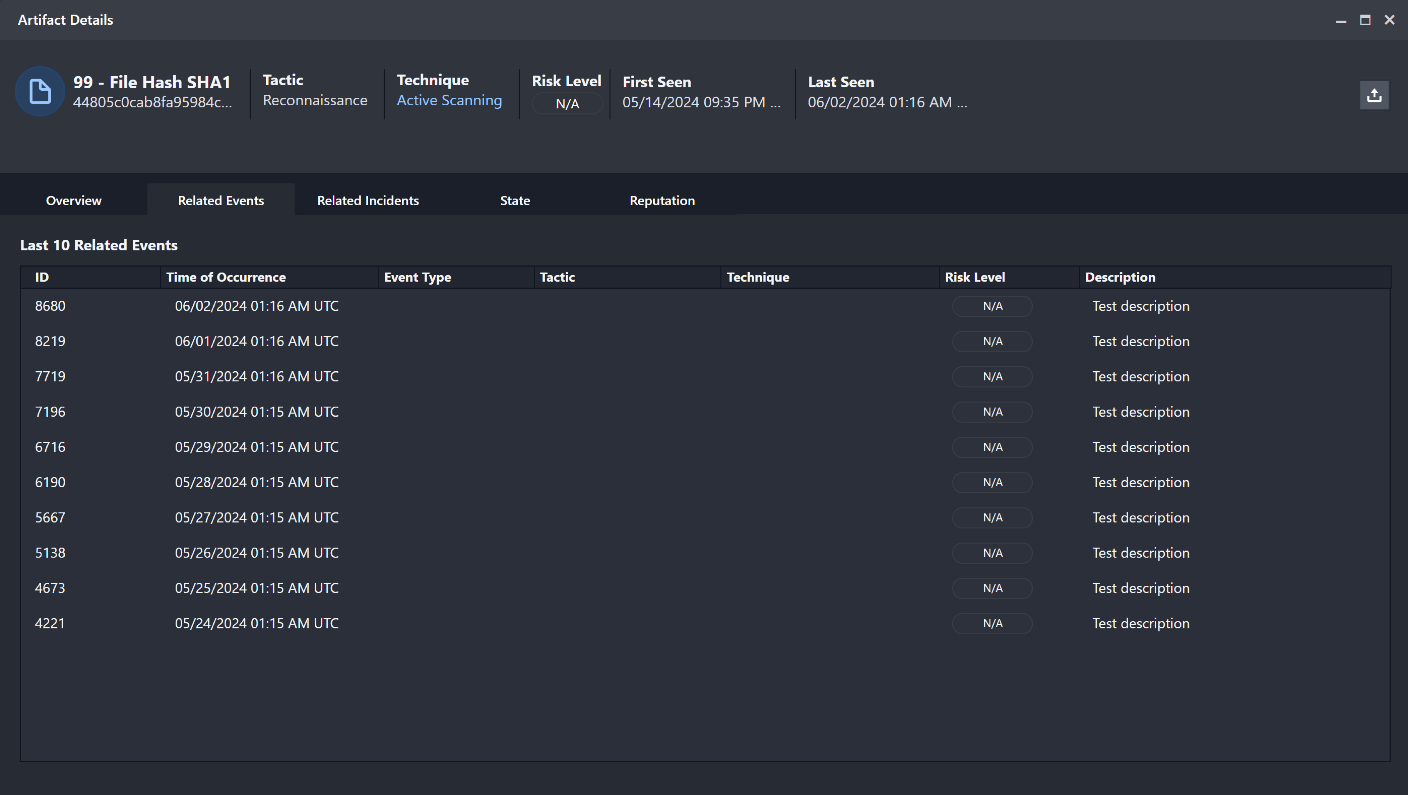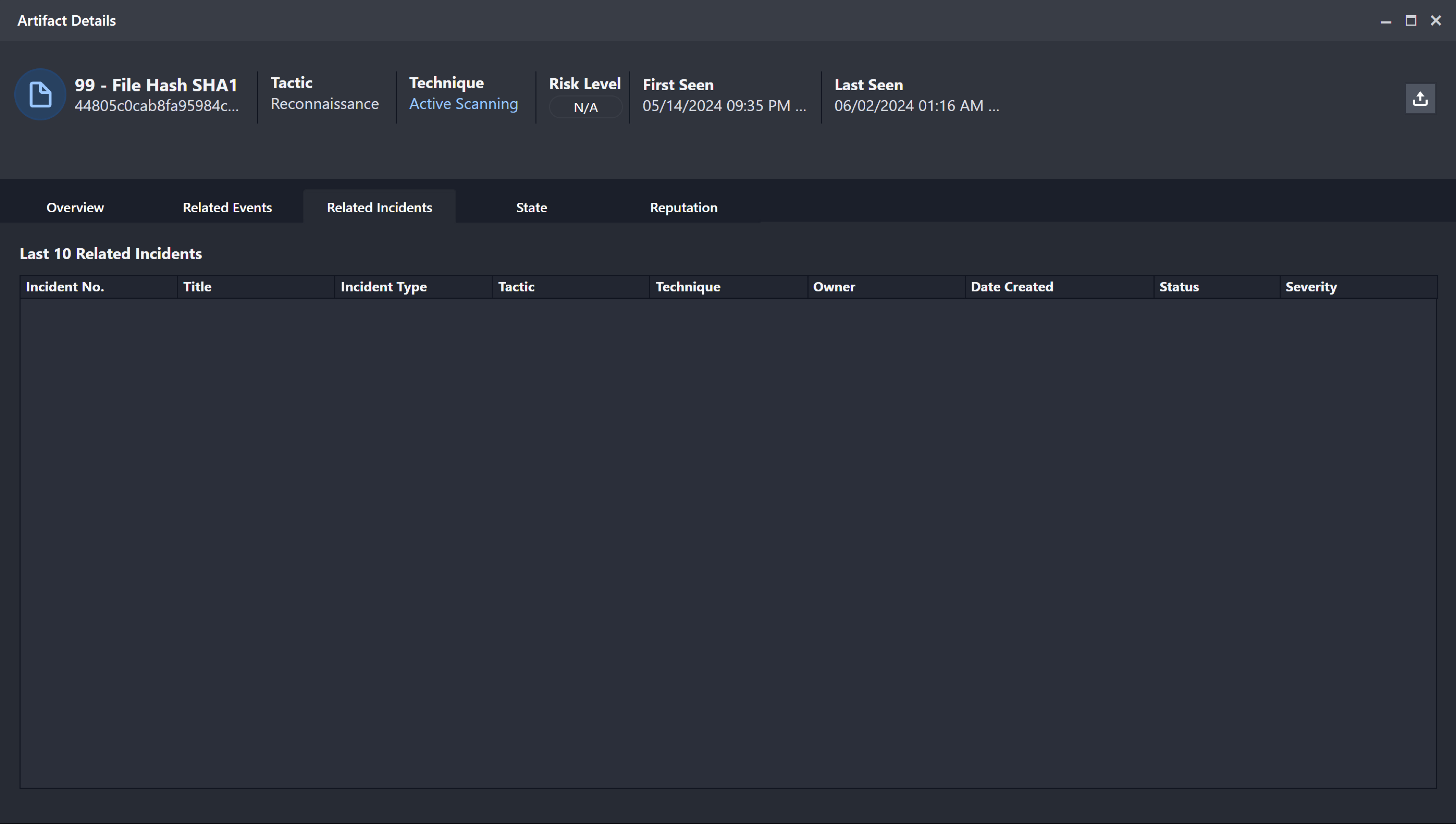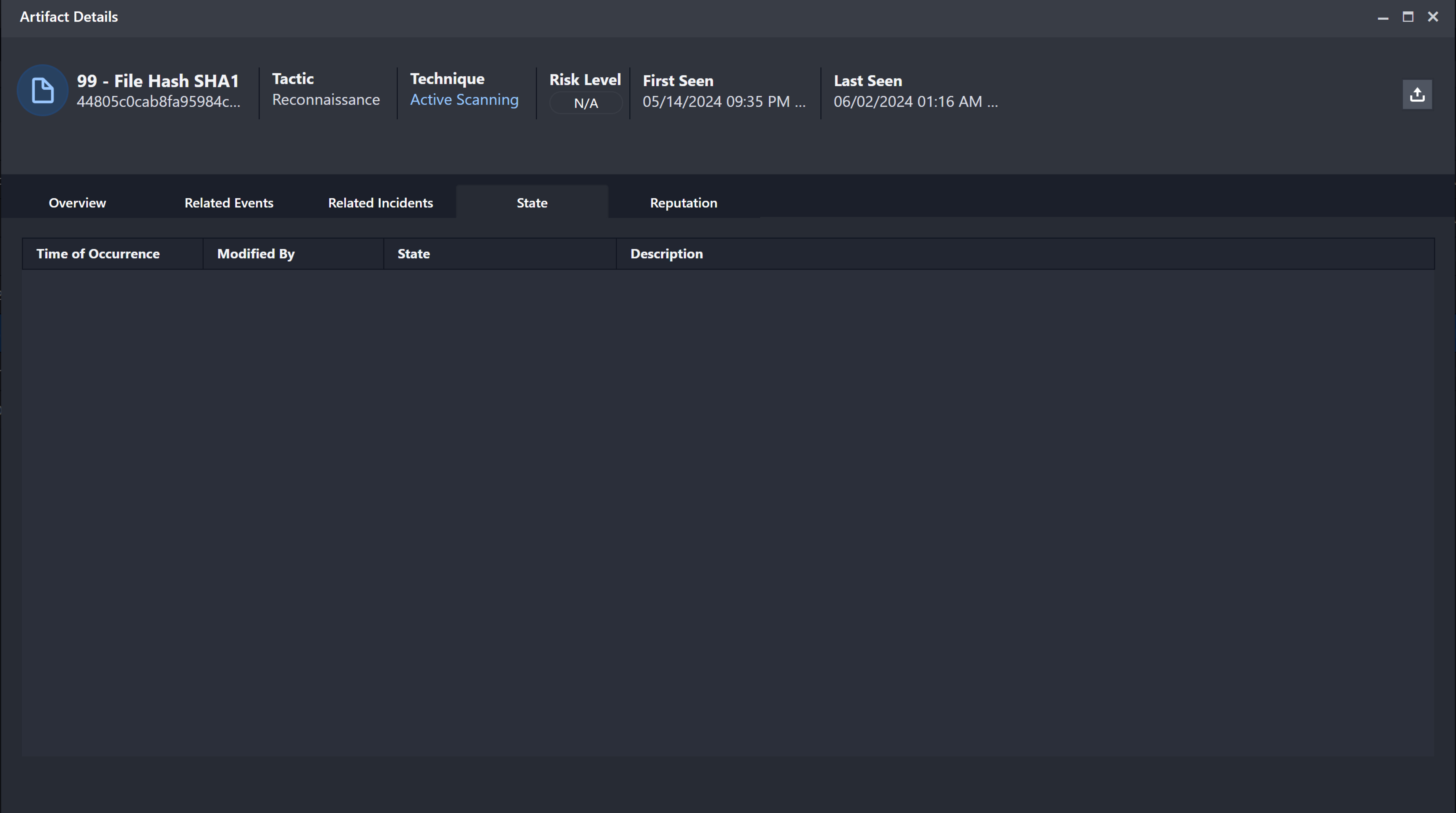 Clicking on an artifact from this list will open up the Artifact Details window where you can view additional details and associated events. There are 5 tabs within Artifact Details: