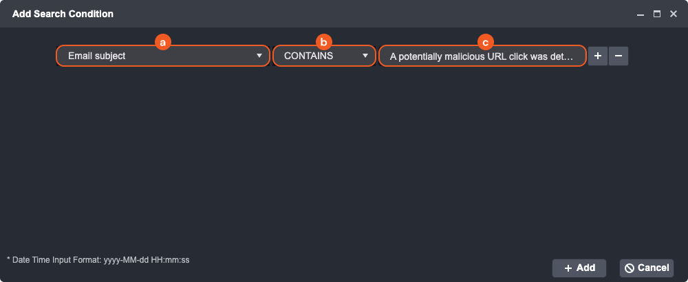 Type "A potentially malicious URL click was detected" into the Value input field.