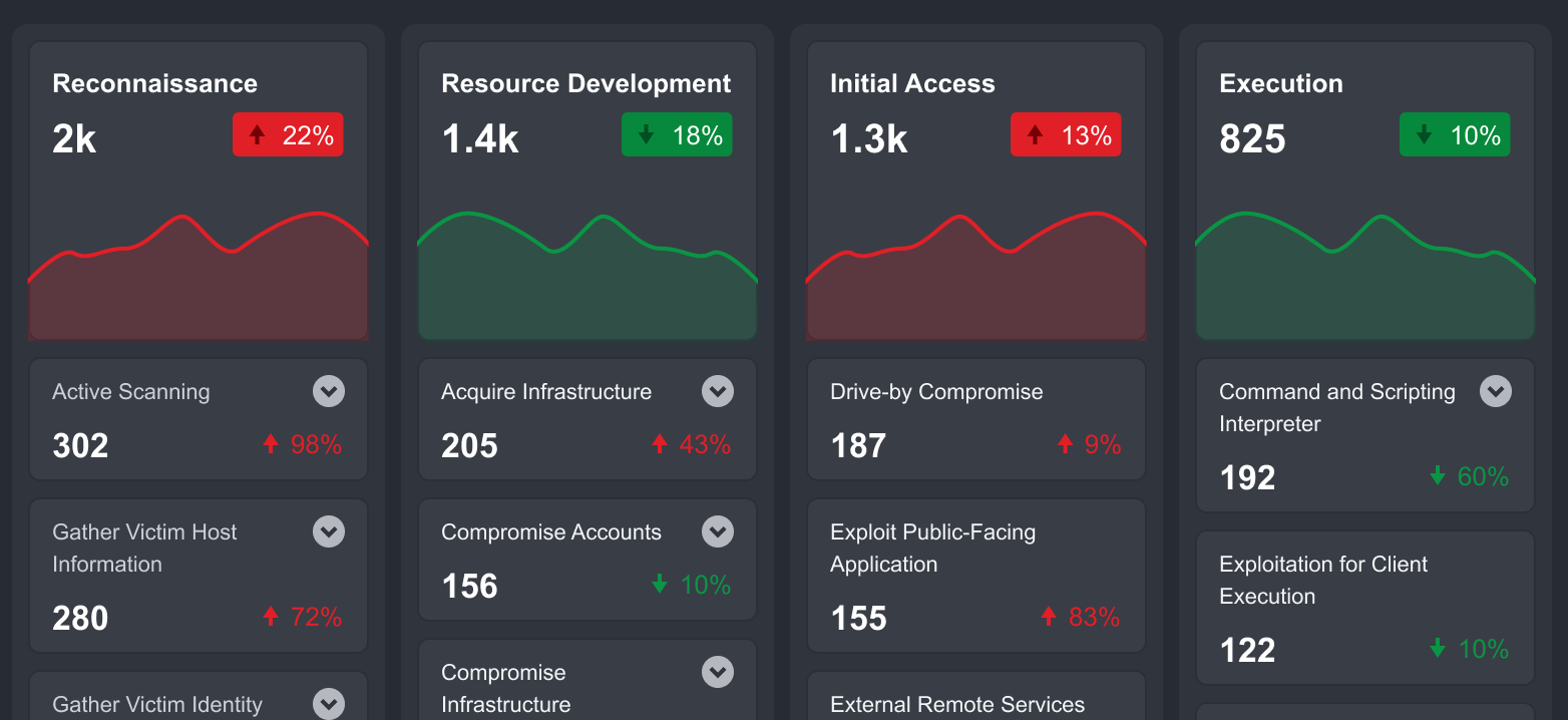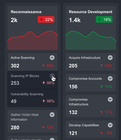 Techniques and Sub-Techniques shown below the tactics section have the event count and the velocity of changes. By default, Sub-Techniques are hidden; you can expand each technique to reveal the underlying Sub-Techniques. You can also click on any of the Tactics, Techniques, or Sub-Techniques to configure search criteria.