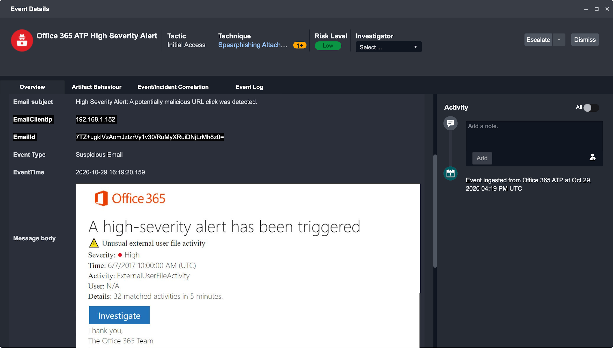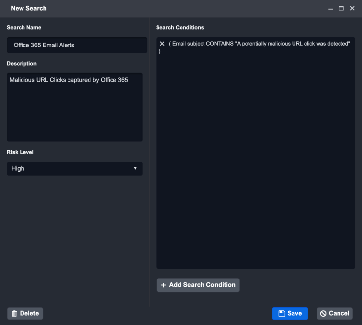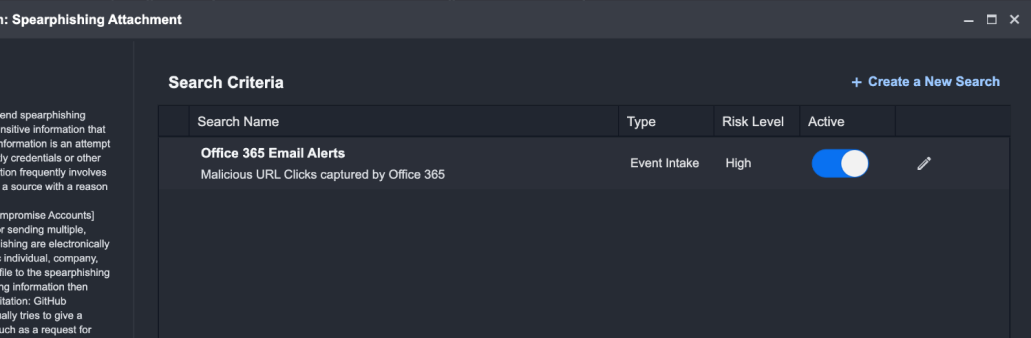 In this example, Office 365 ATP alerts are being automatically ingested to D3 SOAR to create an Event. The search criteria will be looking for a Spearphishing Link Event that generally has the description in the Email Subject as "A potentially malicious URL click was detected."