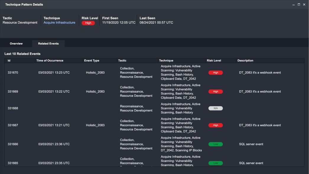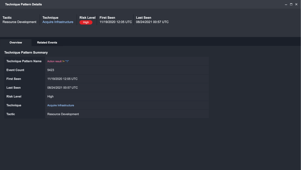 Related Events: Provides a list of all instances where the selected Technique Pattern appears in an event. Clicking on an event will expand to an Events Details window.