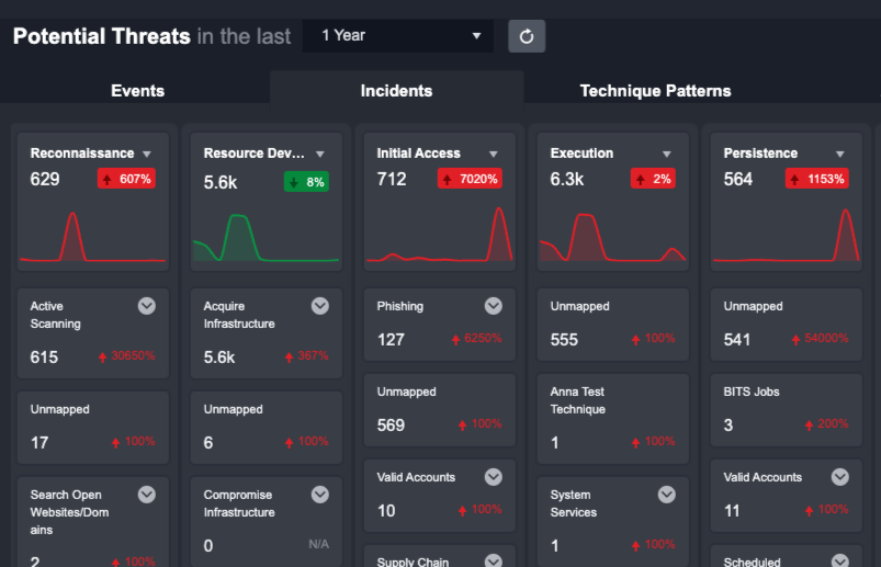 All potential threats in the Events & Incidents tabs are categorized in a MITRE ATT&CK matrix view based on their framework found, underlined in ATT&CK Matrix for Enterprise. This view is designed to highlight any large-scale attacks at a glance and guide you to critical threats that require more immediate attention.
