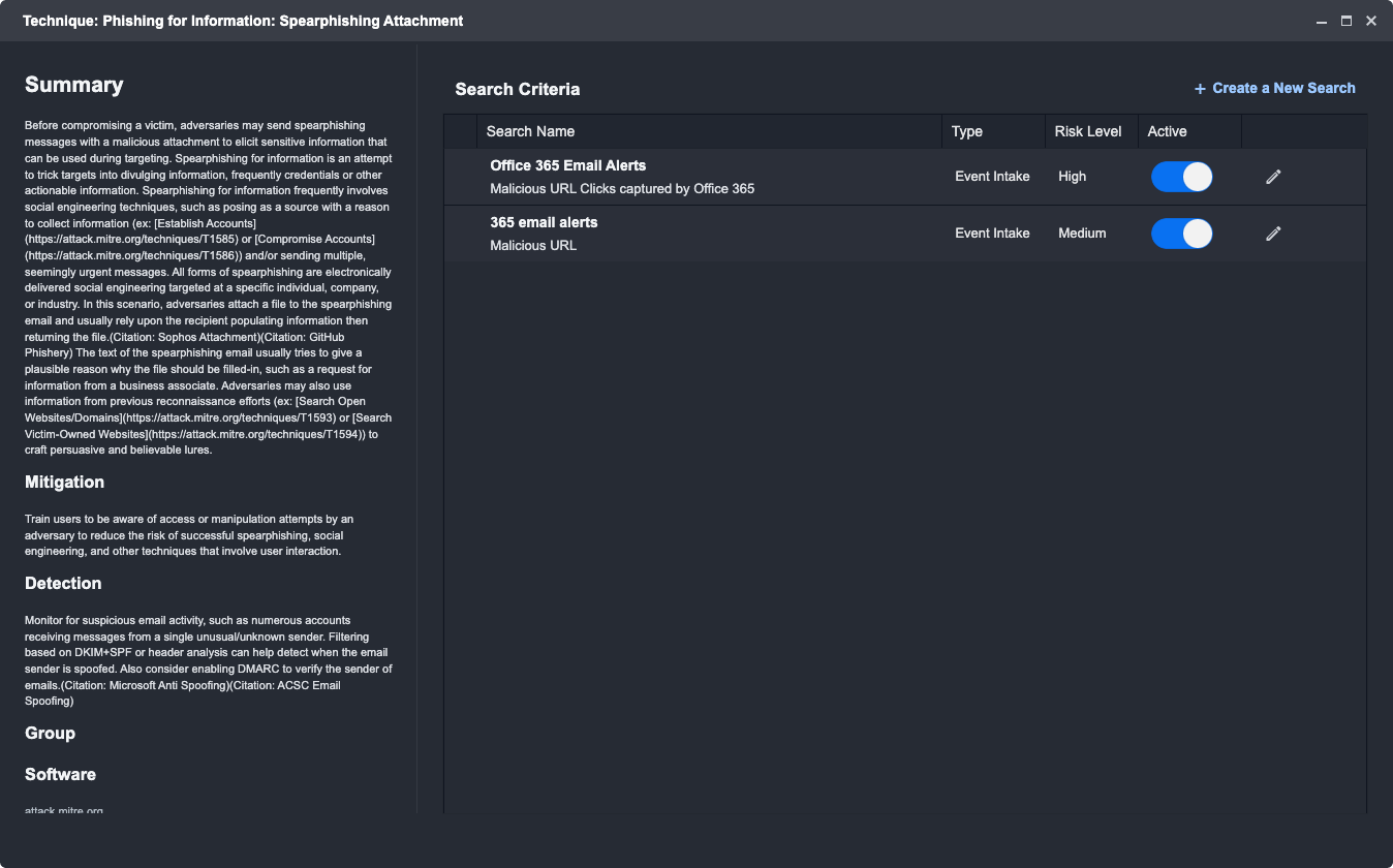 The example below outlines the steps to add a search criteria to the Spearphishing Link technique for Office 365 ATP alerts.